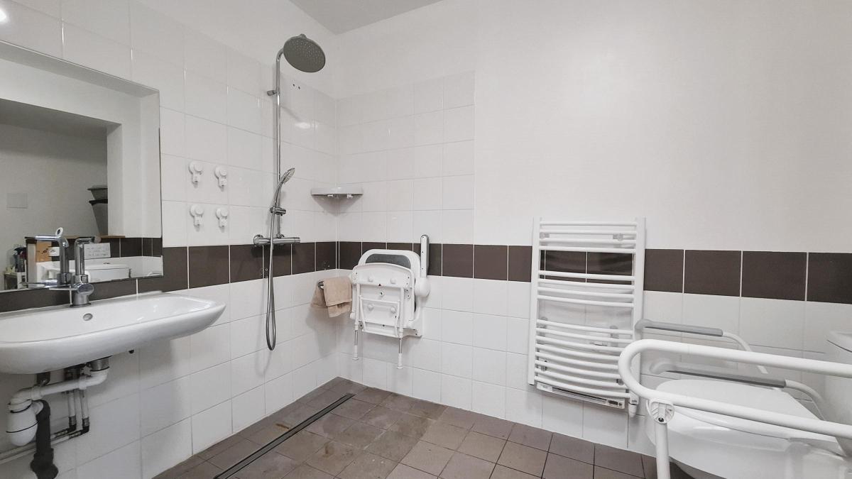 Rez-de-chaussée: salon, salle à manger, cuisine, salle de bain équipée PMR et buanderie.