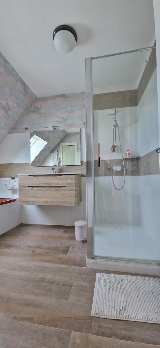 A l’étage : palier , trois chambres, salle de bains (baignoire + douche), WC,