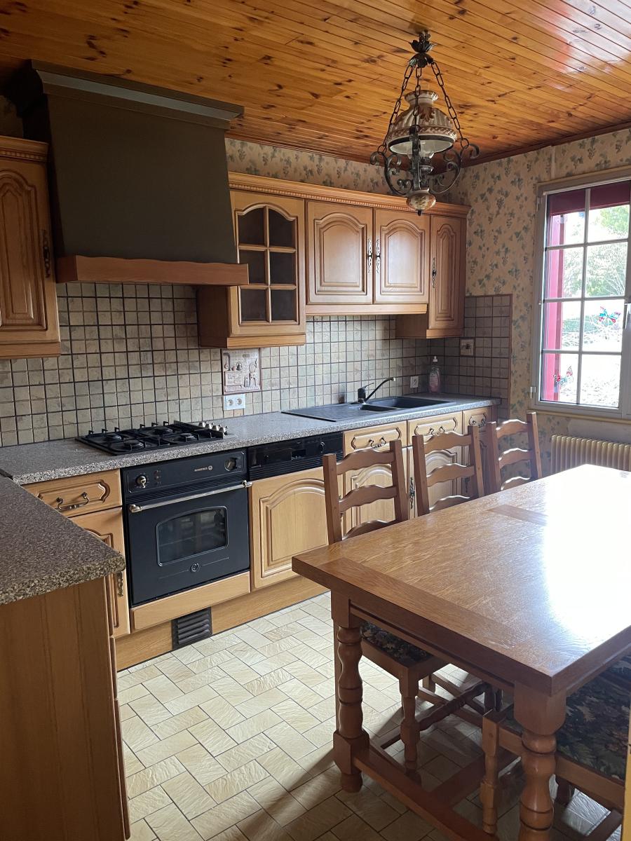 Pavillon sur sous-sol comprenant en rdc un hall d'entrée, une cuisine d'été, une chambre/bureau, une salle d'eau, un cellier/cave, un grand garage. A l'étage, une cuisine équipée, un salon/séjour, quatre chambres et une salle de bains. Chauffage PAC, double vitrage, volets roulants électriques