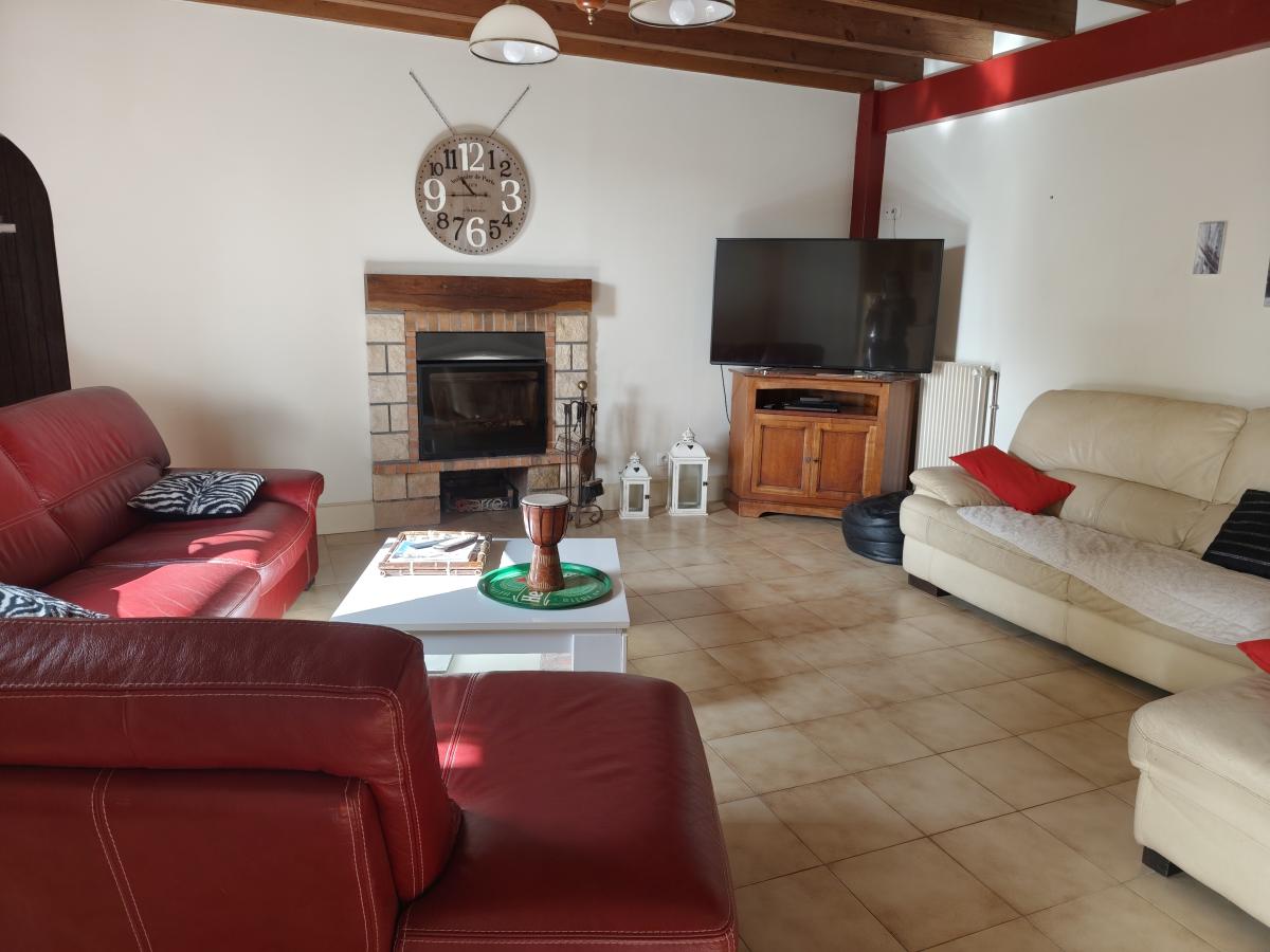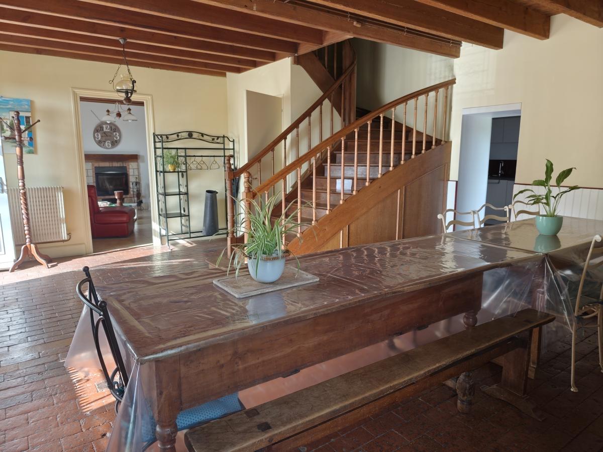 Au calme de sa campagne, dans cadre bucolique, maison ancienne avec beaucoup de cachet avec plusieurs possibilités : demeure familiale ou gîte, offrant beaux volumes : un salon avec une cheminée et poutres apparentes, un séjour avec cheminée et poutres apparentes, une cuisine attenante aménagée et équipée, cinq chambres dont deux communicantes, une salle de bains, une salle d'eau avec W.C, deux W.C séparés.