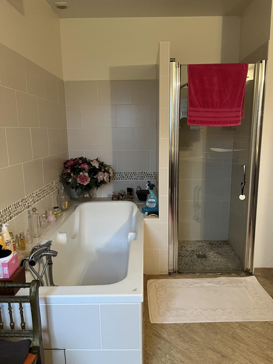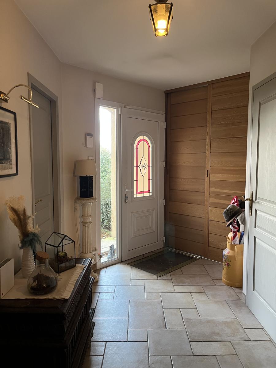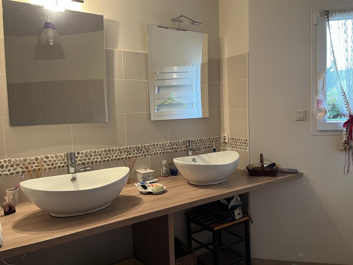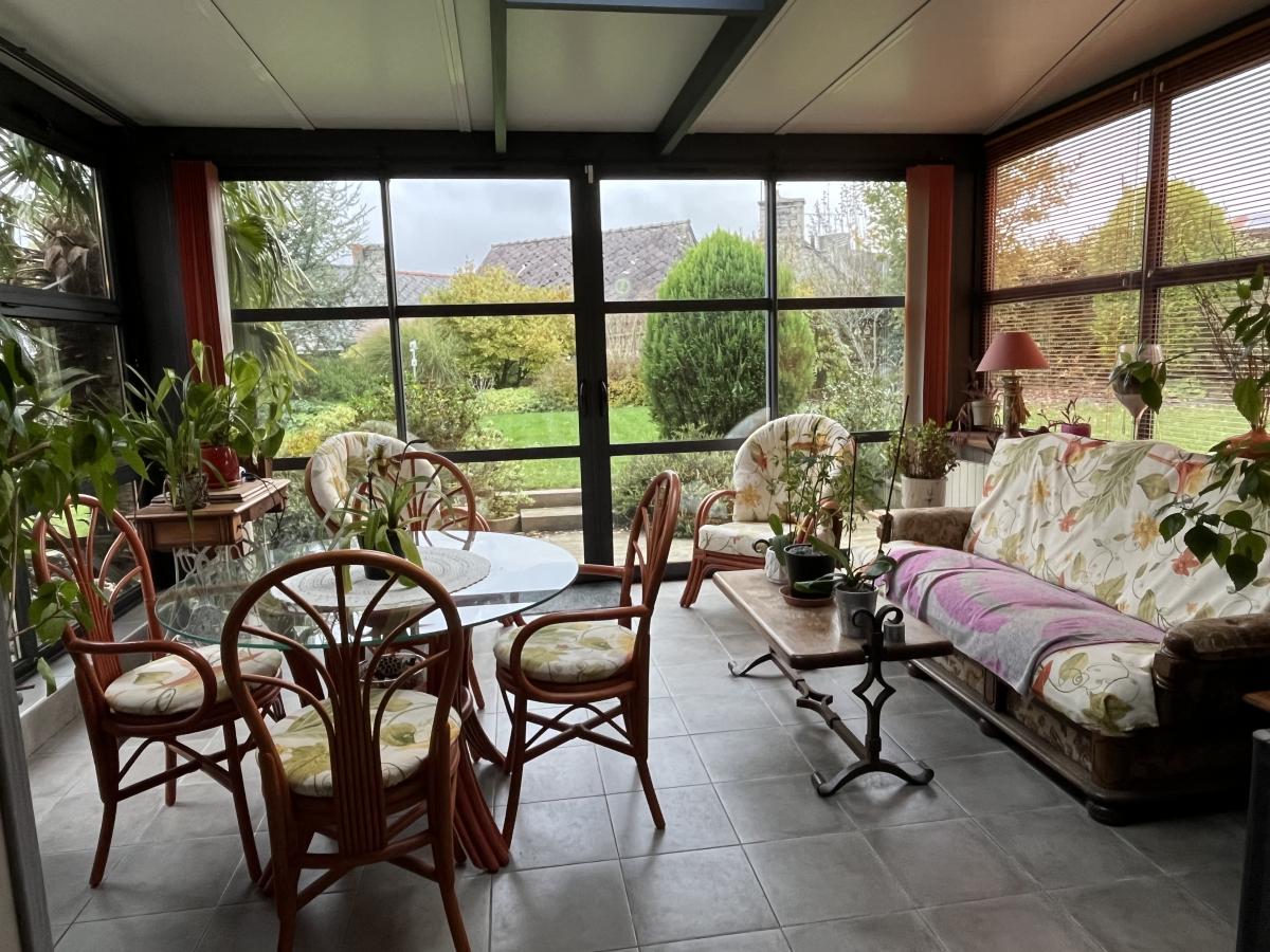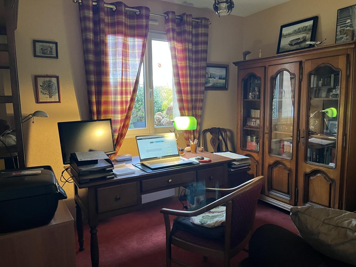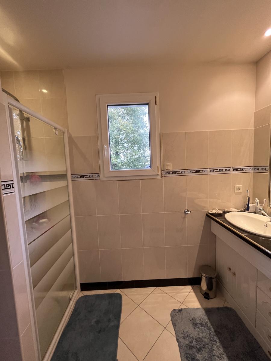 RDC : entrée avec placard, wc avec lave-mains, trois chambres, salle de bains + douche, trois chambres, séjour-salon avec poêle à bois-pièce vitrée, cuisine aménagée et équipée semie-ouverte, arrière cuisine,( deux greniers)