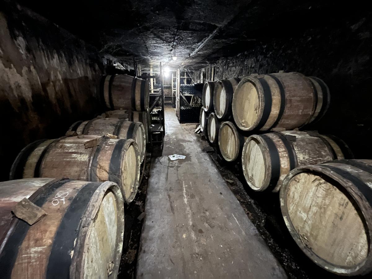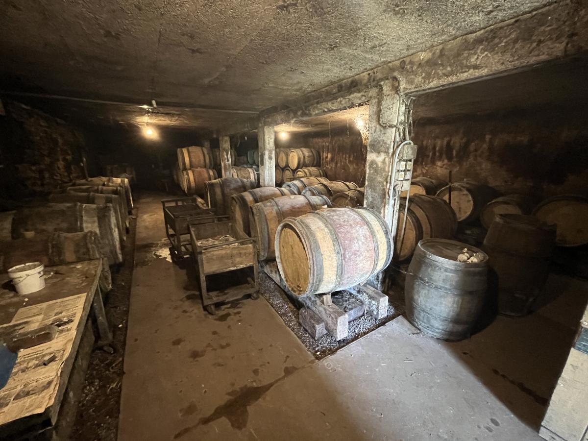 -Une cave à fûts d’environ 83 m² avec sol béton et gravier, plafond isolé, chauffage, climatisation et hauteur sous plafond de 2.10 m.