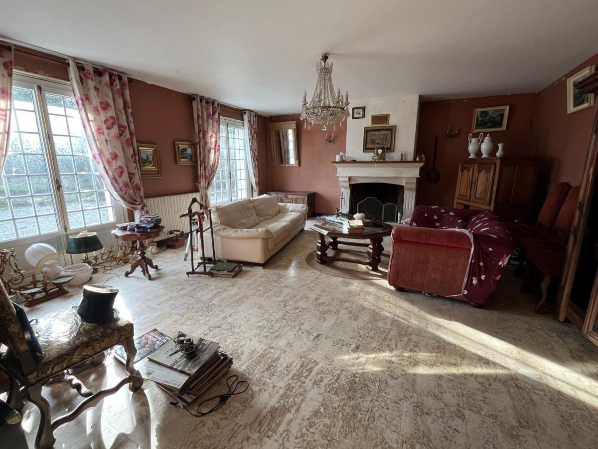 Hall d'entrée avec départ d'escalier, séjour avec cheminée 35 m², cuisine aménagée avec coin repas et cheminée insert 25 m², bureau, deux chambres 12 m² et 12 m², salle de bains, wc, chaufferie / buanderie 10 m²,