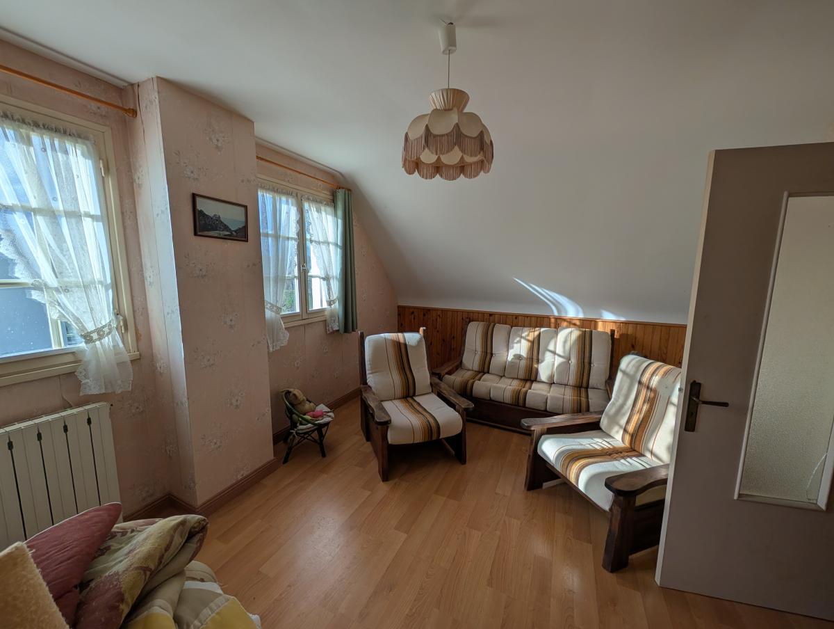 A l'étage : couloir de distribution, deux chambres, grenier, salle d'eau et WC.