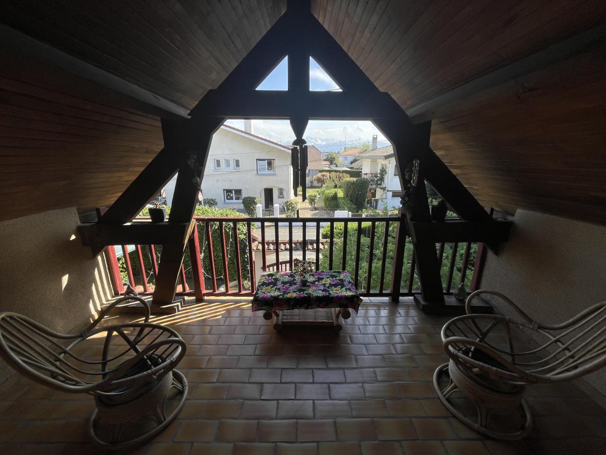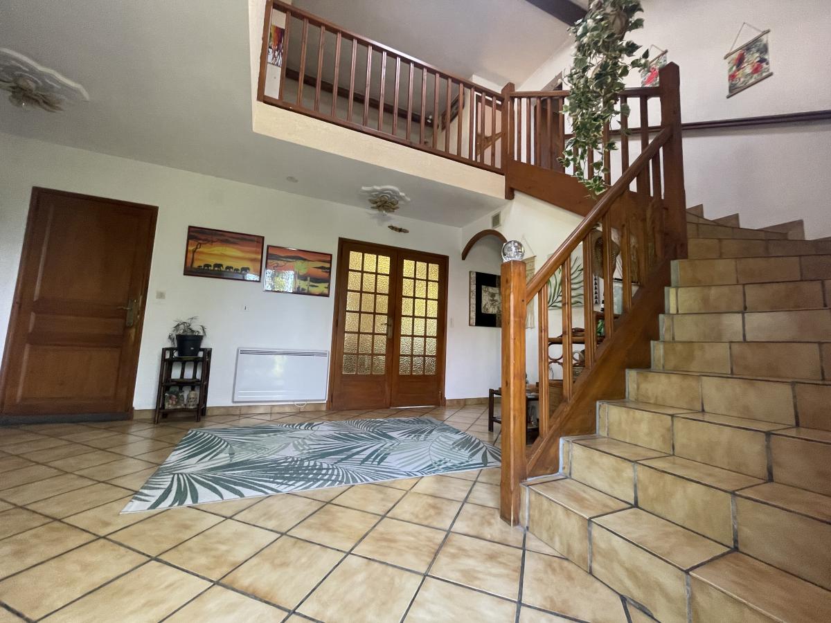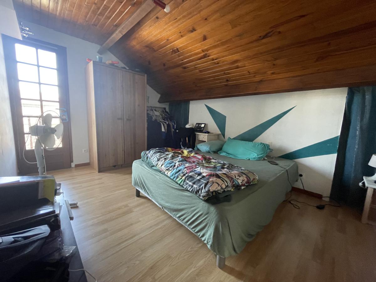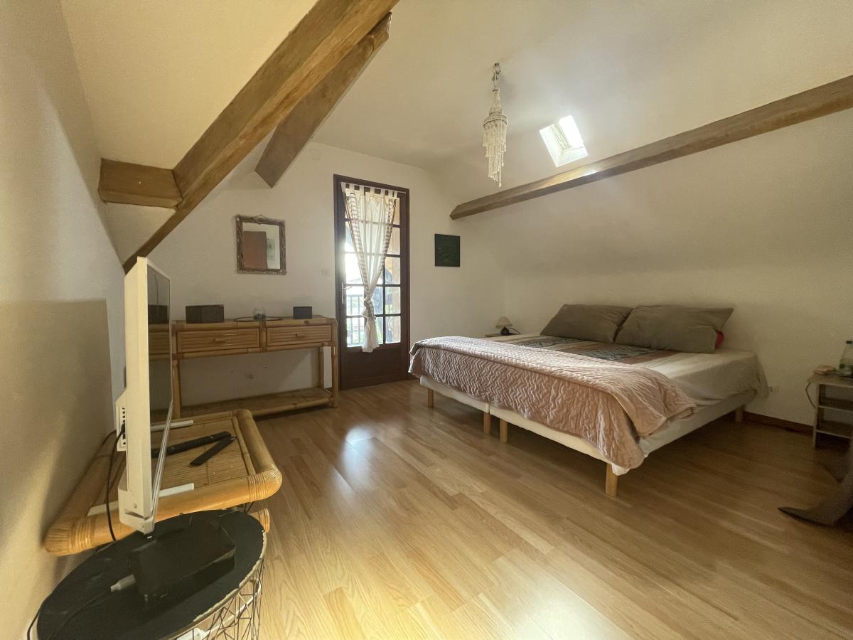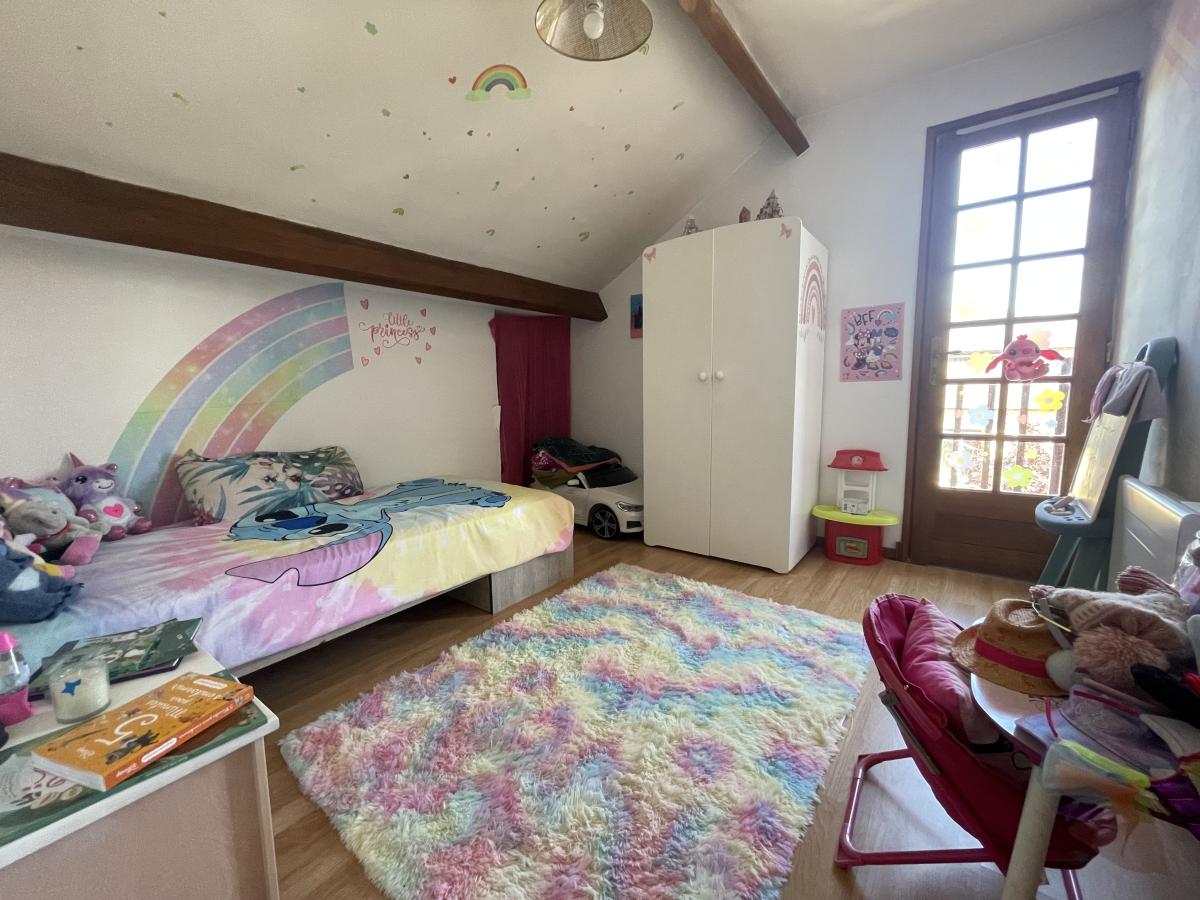 À l’étage, une mezzanine distribue quatre chambres supplémentaires ainsi qu’un WC, offrant un espace nuit fonctionnel et bien agencé.