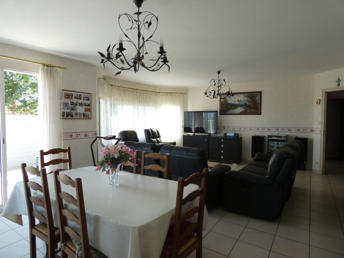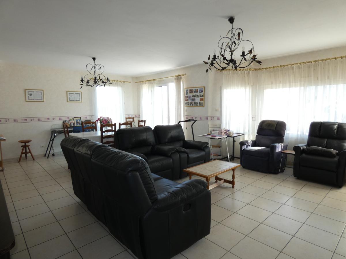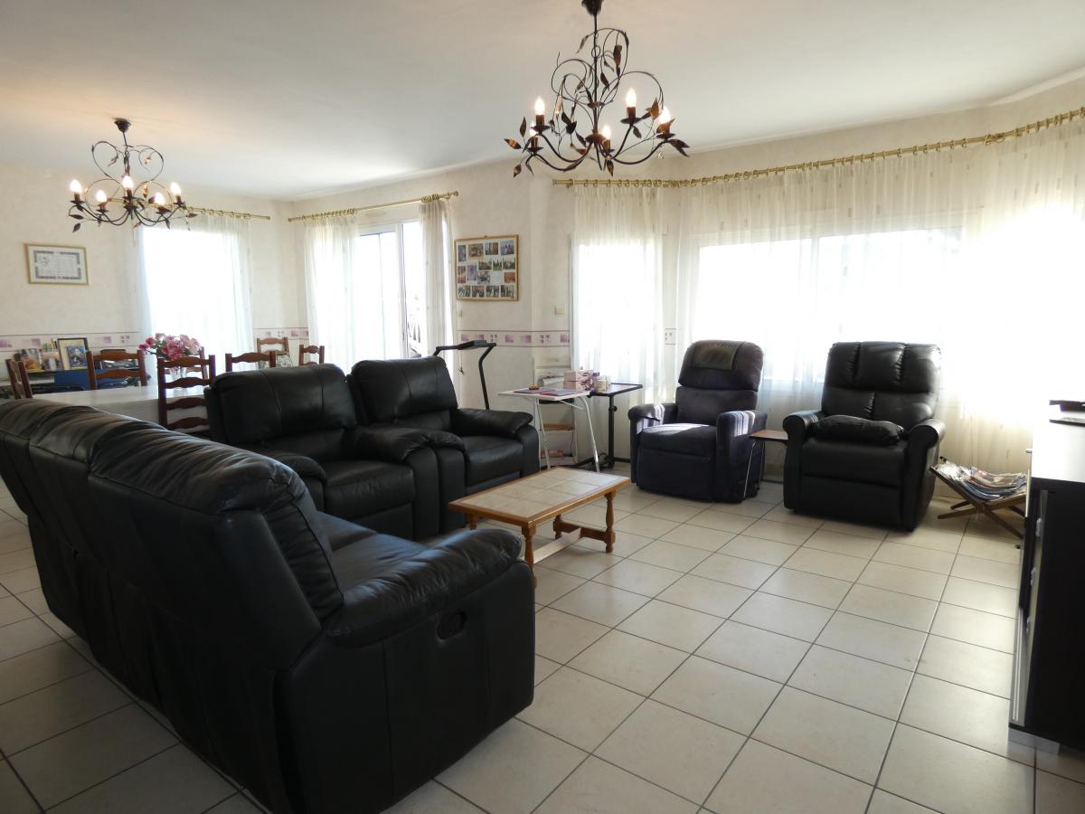 SAINT MARTIN DES CHAMPS, belle maison (2008) de 163 m² env. comprenant grande pièce de vie, cuisine, 2 chambres, cellier, wc, salle d'eau. A l'étage : 4 chambres, grand dégagement, salle de bains, wc. Garage double. Grande terrasse carrelée. Terrain 825 m². Pompe à chaleur. Adaptée PMR. Éligible à la fibre. Classification énergétique B et GES A.