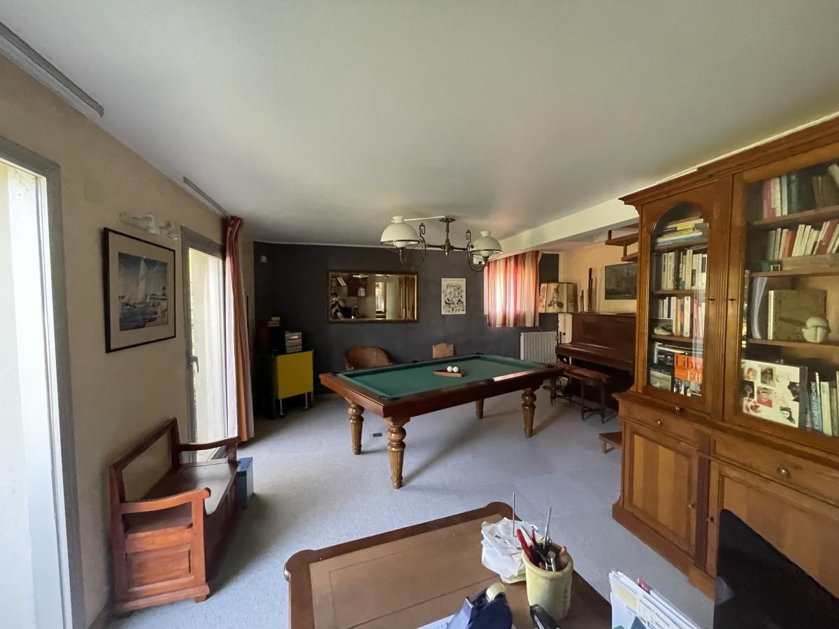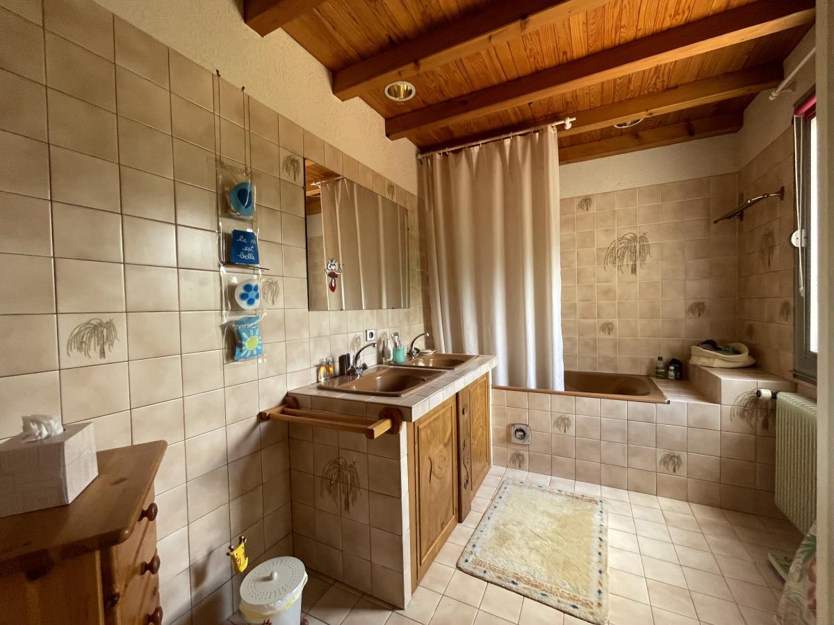 A l'étage : salle de jeux (en accès direct et plain-pied sur l'avant de la propriété), espace lingerie, puis à un 1/2 étage supérieur on retrouve salle d'eau avec w.c. et sauna, trois chambres avec placard dont une avec accès à une terrasse,