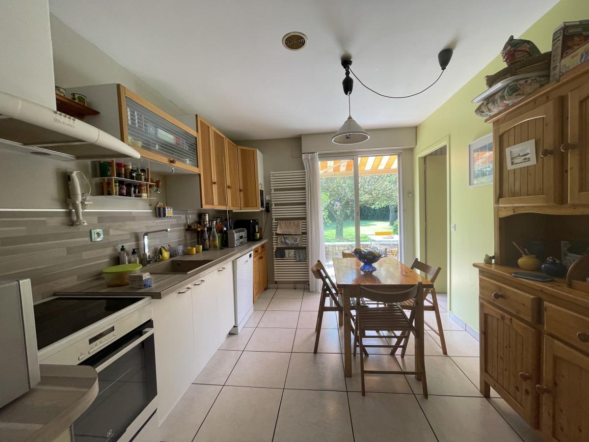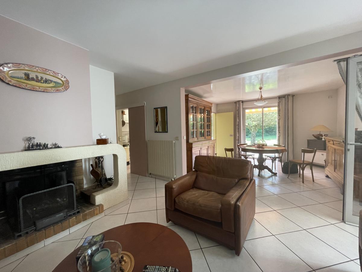 Cette maison se compose actuellement d'un rez-de-jardin où on y retrouve un hall d'entrée, un séjour/salon avec sa cheminée ouverte et sa baie avec vue sur le terrain arboré, une cuisine, un bureau (ou une chambre), dégagement avec w.c. et accès au garage.