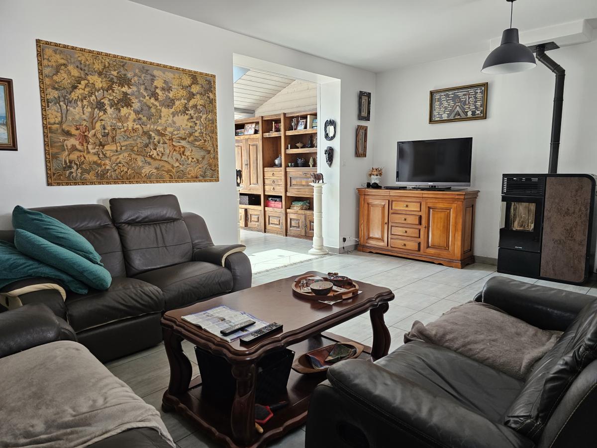 - Une première maison de plain-pied, d'environ 110,50 m² composée d'une belle pièce de vie avec un poêle à granulés, une cuisine aménagée et équipée, une véranda, deux chambres avec placards, un bureau, une salle d'eau et un WC (adaptés PMR).