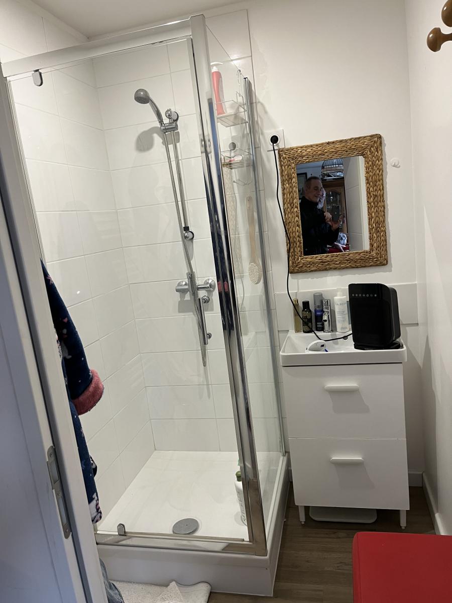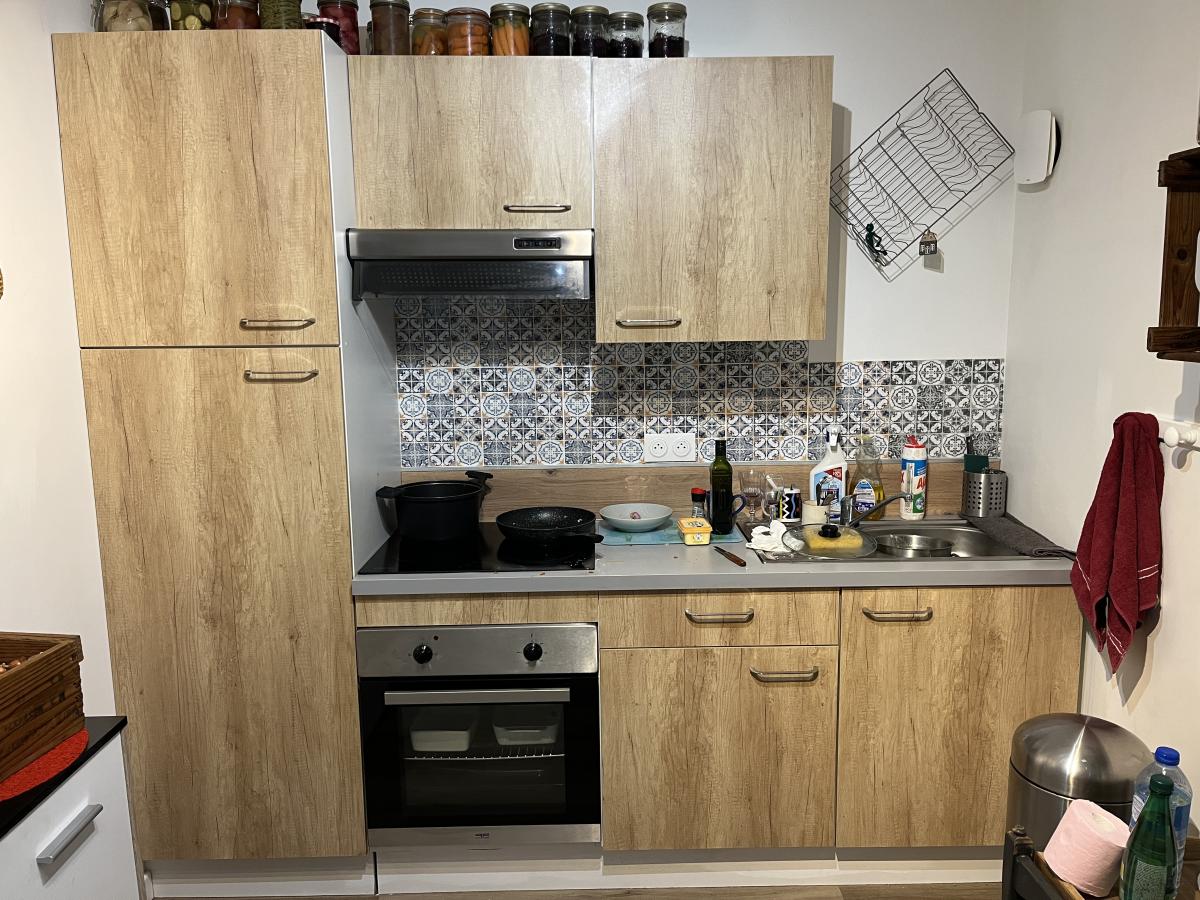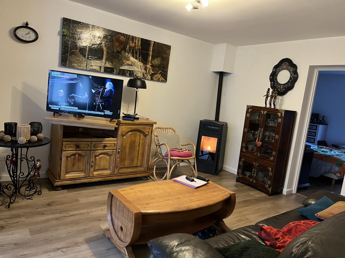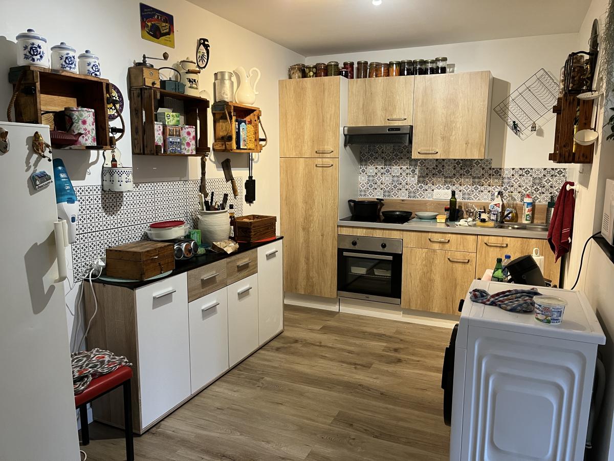 Le premier étage comprend un appartement avec entrée sur cuisine équipée de 13,7m2, salle de séjour de 17m2, une chambre de 14,5m2, salle de bains de 13m2 avec lavabo, douche, wc et baignoire. Loyer hors charges de 560€