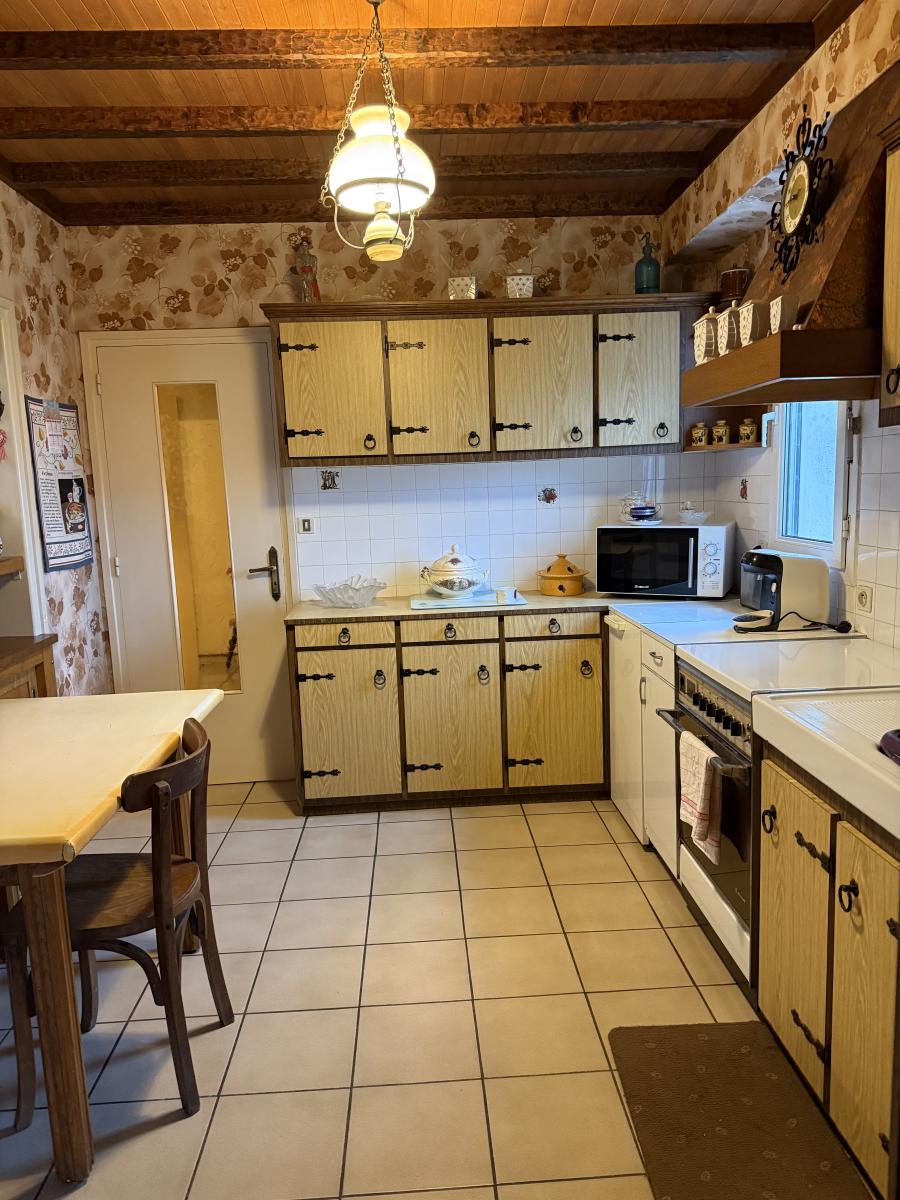 Sous-sol total : chaufferie et arrière cuisine, débarras, cave et garage.