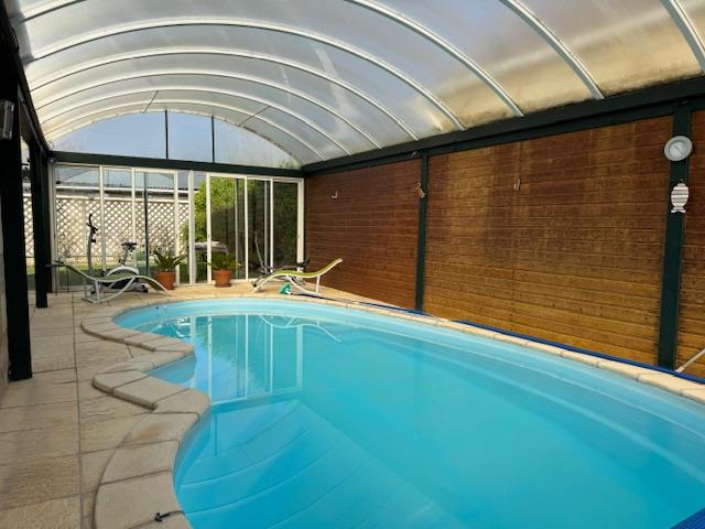 Piscine couverte , cave et très grand atelier/garage de 150m2. Chauffage par pompe à chaleur pour le tout.