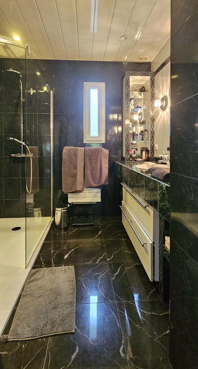 Le rez-de-chaussée propose également un espace nuit confortable comprenant une grande chambre avec accès terrasse, un dressing et une salle d’eau.