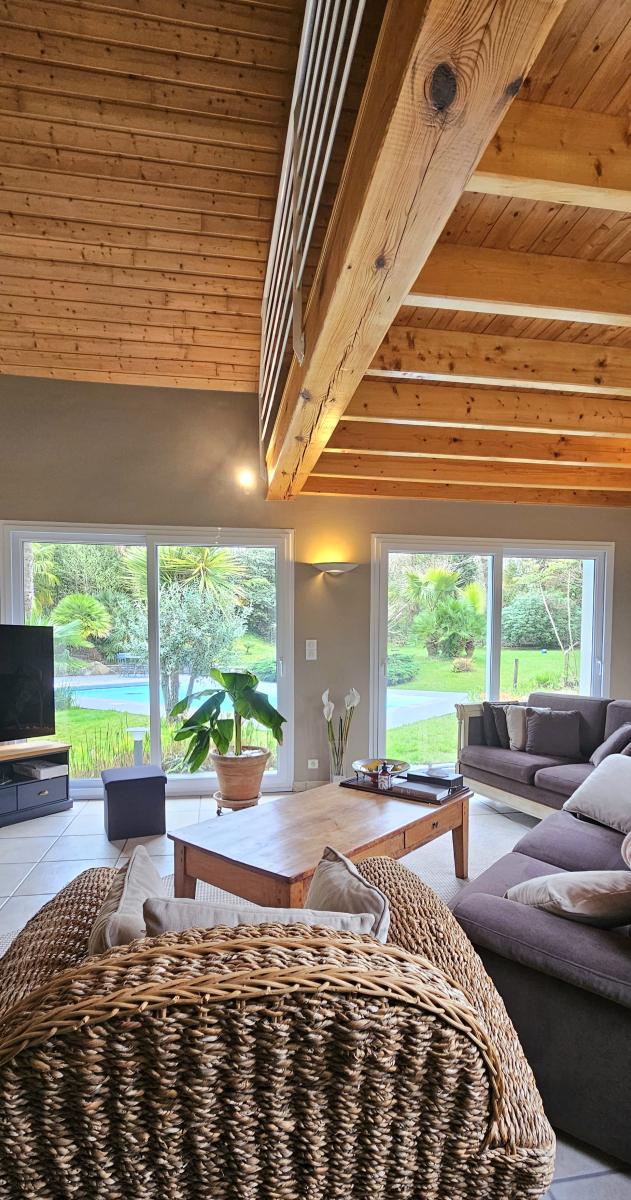 À l’extérieur, le jardin clos et soigneusement entretenu accueille une piscine chauffée avec espace détente, ainsi que des dépendances pratiques : chalet en pierre, carport et cave à vin. Un parking bitumé peut accueillir jusqu'à 5 véhicules.