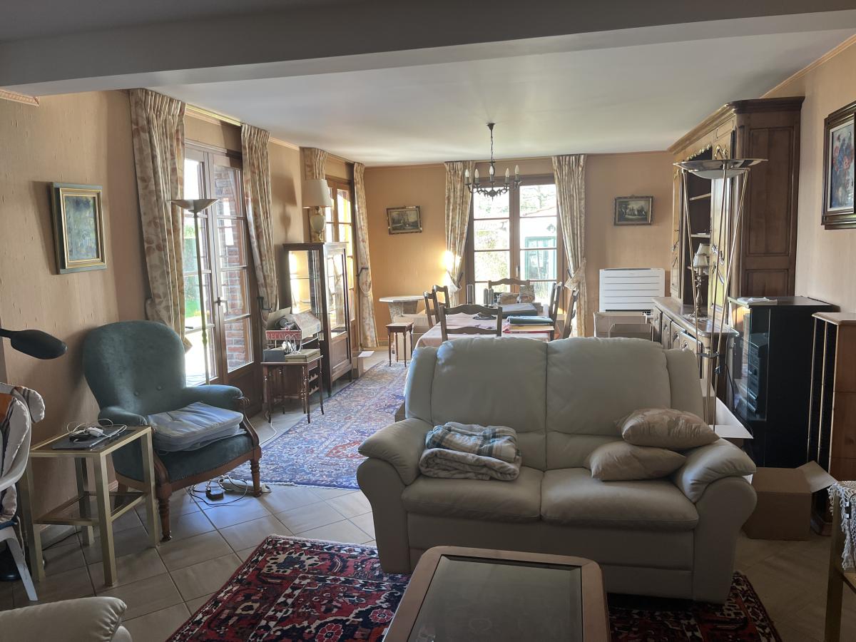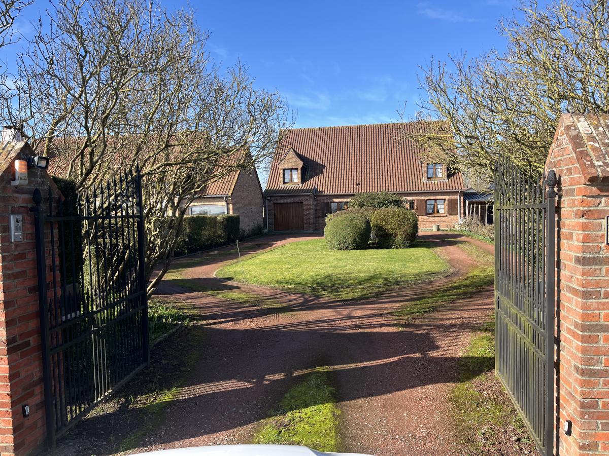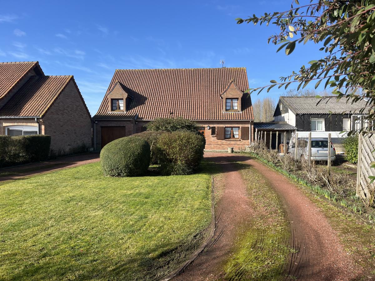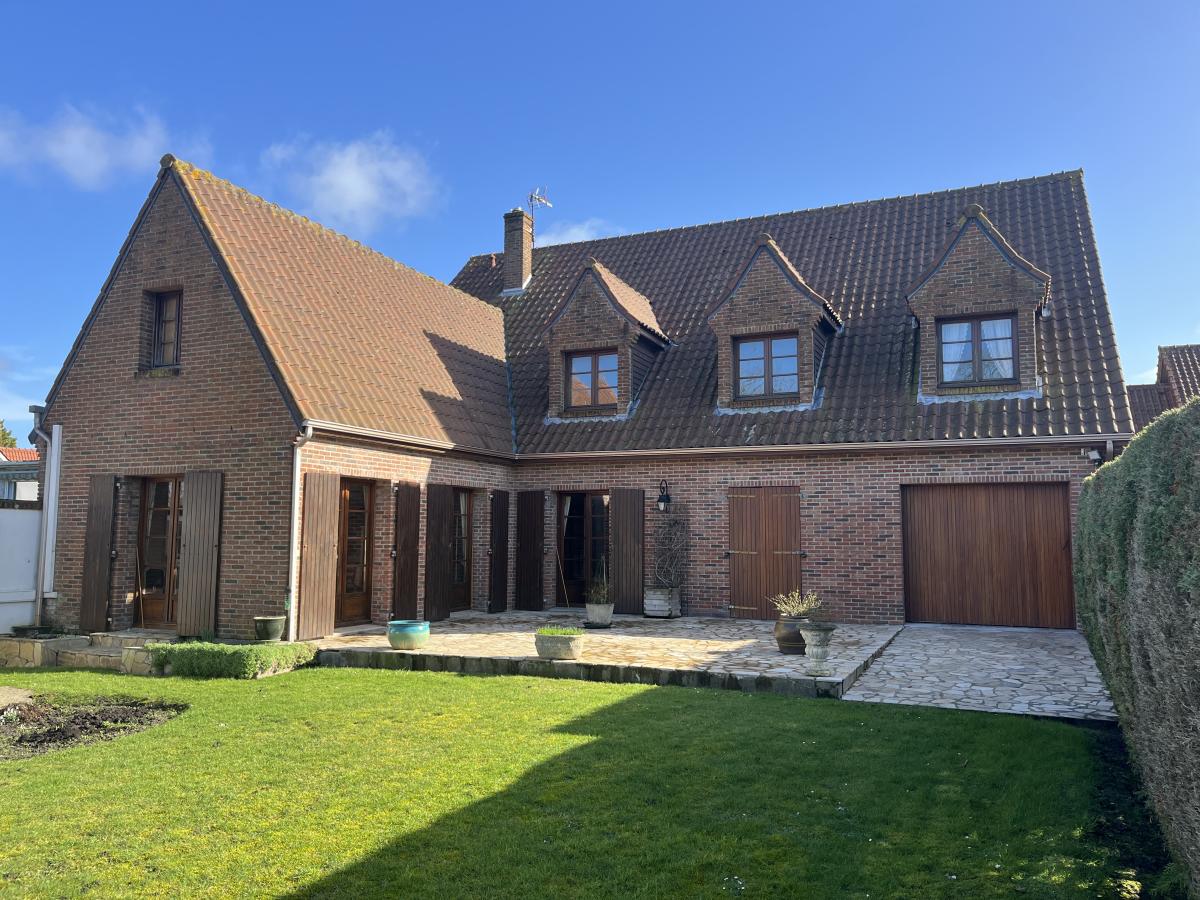 Campagne toute proche de CALAIS, BELLE CONSTRUCTION INDIVIDUELLE de 1989 comprenant large hall d'entrée de 23m2 avec escalier et desservant notamment wc, vestiaire et dressing. Le séjour de 51m2 est orienté sur l'arrière et donne sur le jardin côté sud-ouest. Le rez de chaussée comprend aussi une cuisine de 16m2, une grande chambre de 16m2, salle de bains de 14m2 et garage traversant vers jardin. A l'étage vaste pièce en mezzanine qui dessert 2 chambres de 17m2 environ, une salle de bains de 16m2 avec wc et un grand grenier aménageable, le tout sur dalle béton. Surface habitable d'environ 235m2. Chauffage électrique et par pompe à chaleur air-air, assainissement individuel.