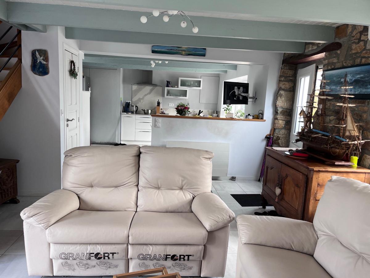 La troisième de 70 m2, perpendiculaire aux autres, laissée intentionnellement dans un pur style breton, est en location saisonnière chez Gîtes de France et contient :