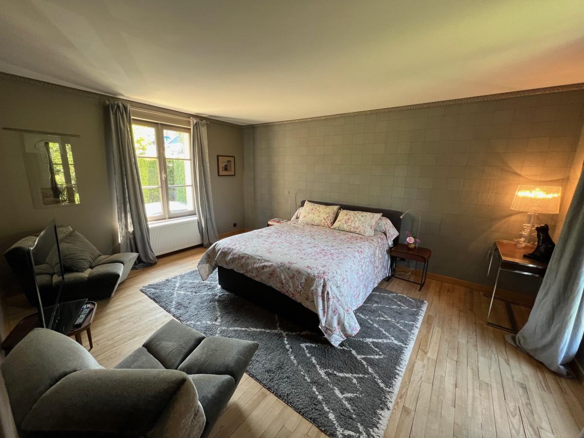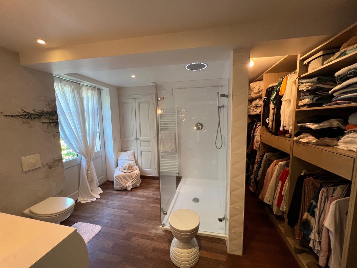 - Au rez-de-chaussée ; Entrée, salle à manger avec cheminée ouverte, salon avec cheminée, autre salon avec poêle à bois et bureau, cuisine aménagée et équipée, couloir desservant une suite parentale composée d'une grande chambre avec salle d'eau et wc et dressing, salle de sport