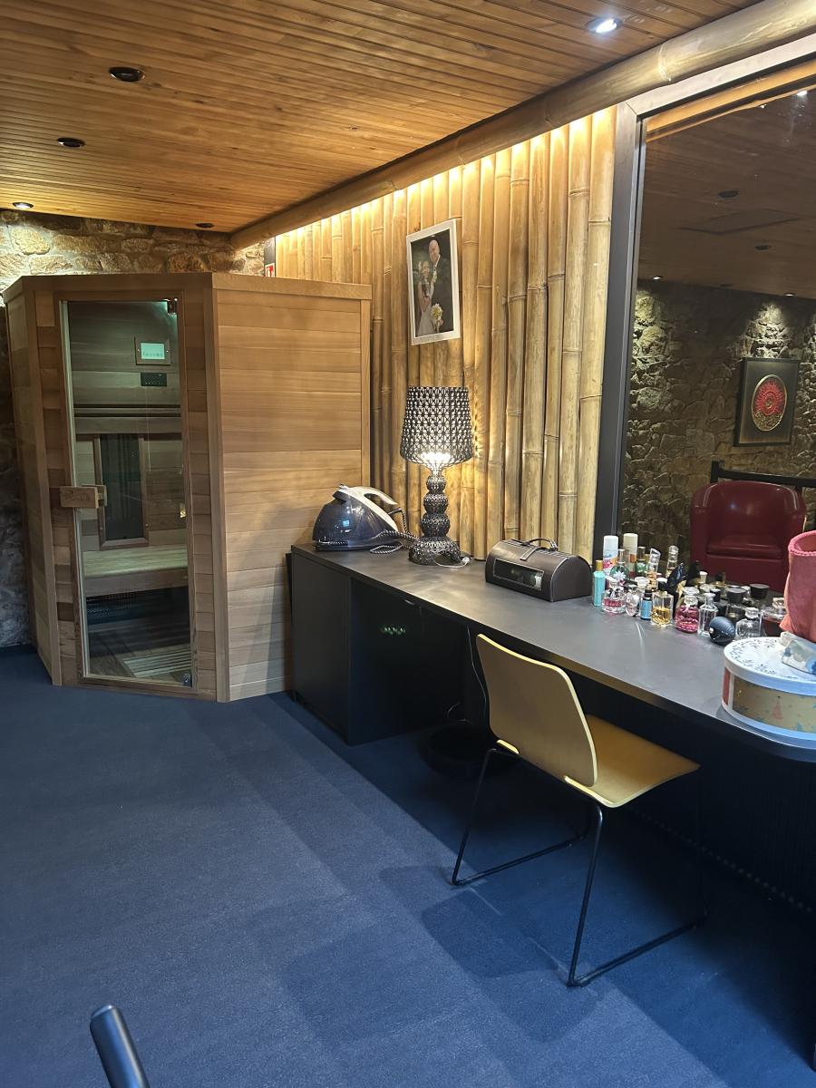 A l'étage une partie privée sur mezzanine avec un espace détente, un sauna, une coiffeuse, suivi d'un salon avec dressing, une suite parentale avec une salle d'eau avec WC, une grande chambre en enfilade une autre chambre avec accès au hall d'accueil, une terrasse.