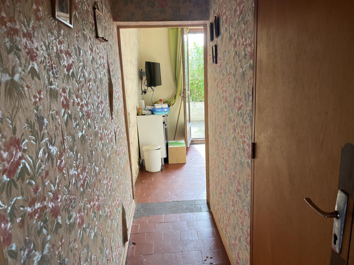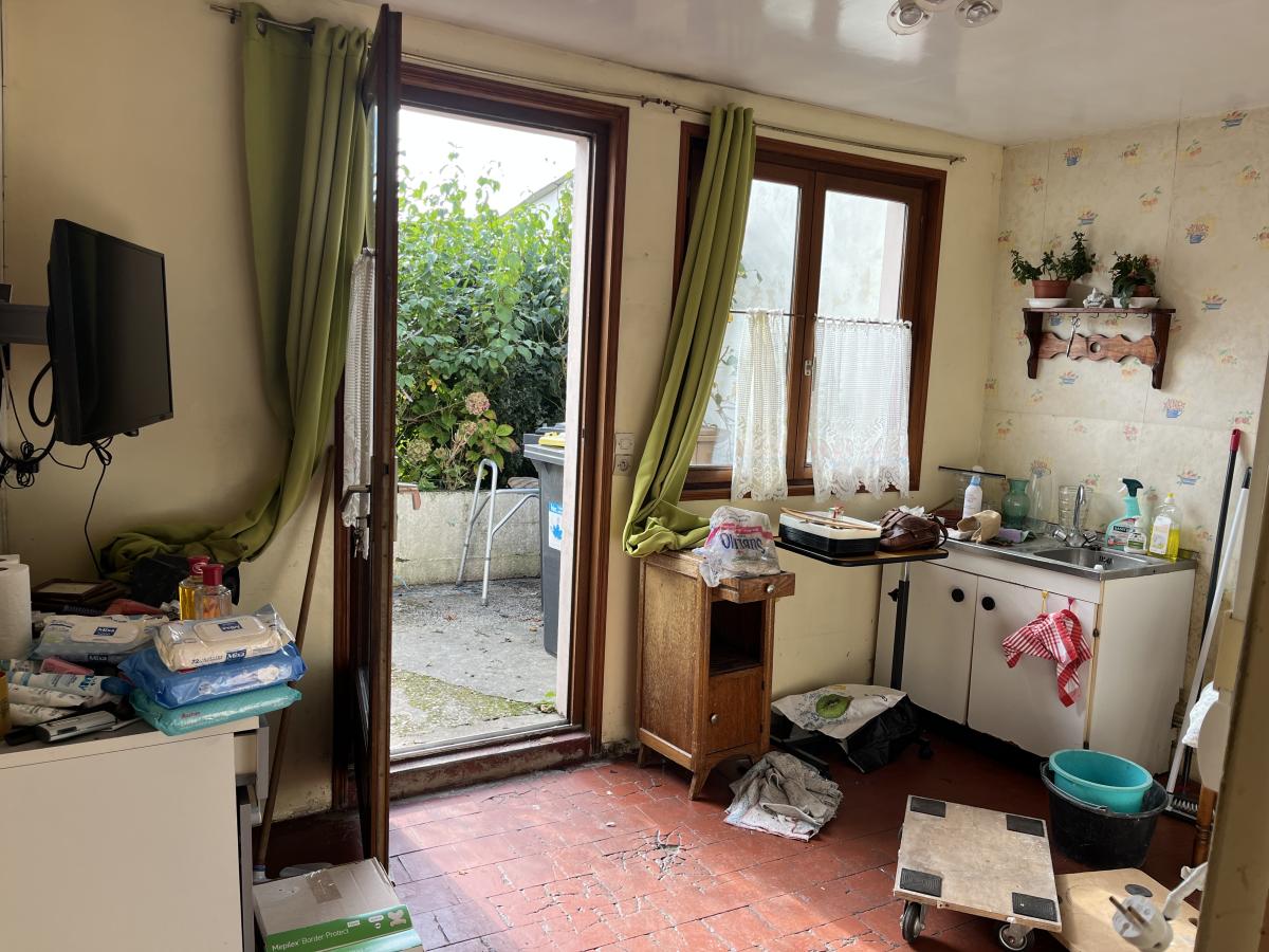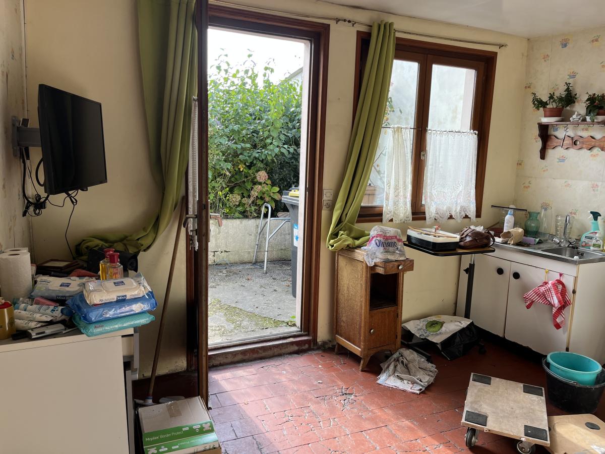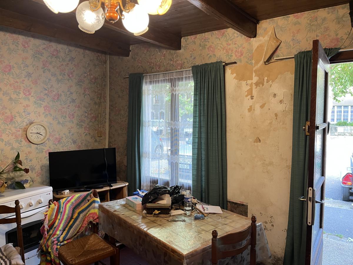 Centre ville, MAISON de ville ancienne à rénover complétement comprenant entrée sur séjour de 14m2, salle d'eau au milieu et cuisine sur l'arrière de 10,5m2. A l'étage une chambre. Jardin et dépendance. Surface habitable d'environ 46m2. Toiture correct et tout à l'égout. Le reste intégralement à rénover (fenêtres, électricité, isolation....). Jardin environ 50m2 sud-ouest.