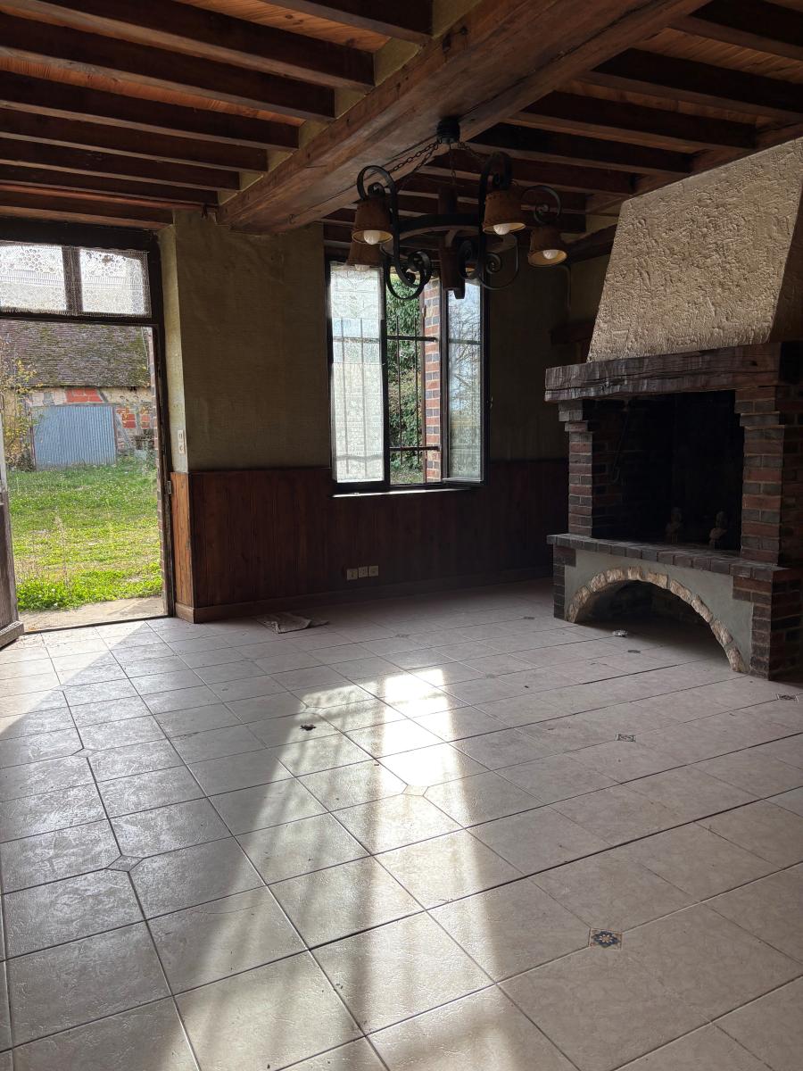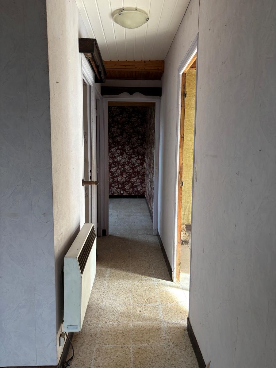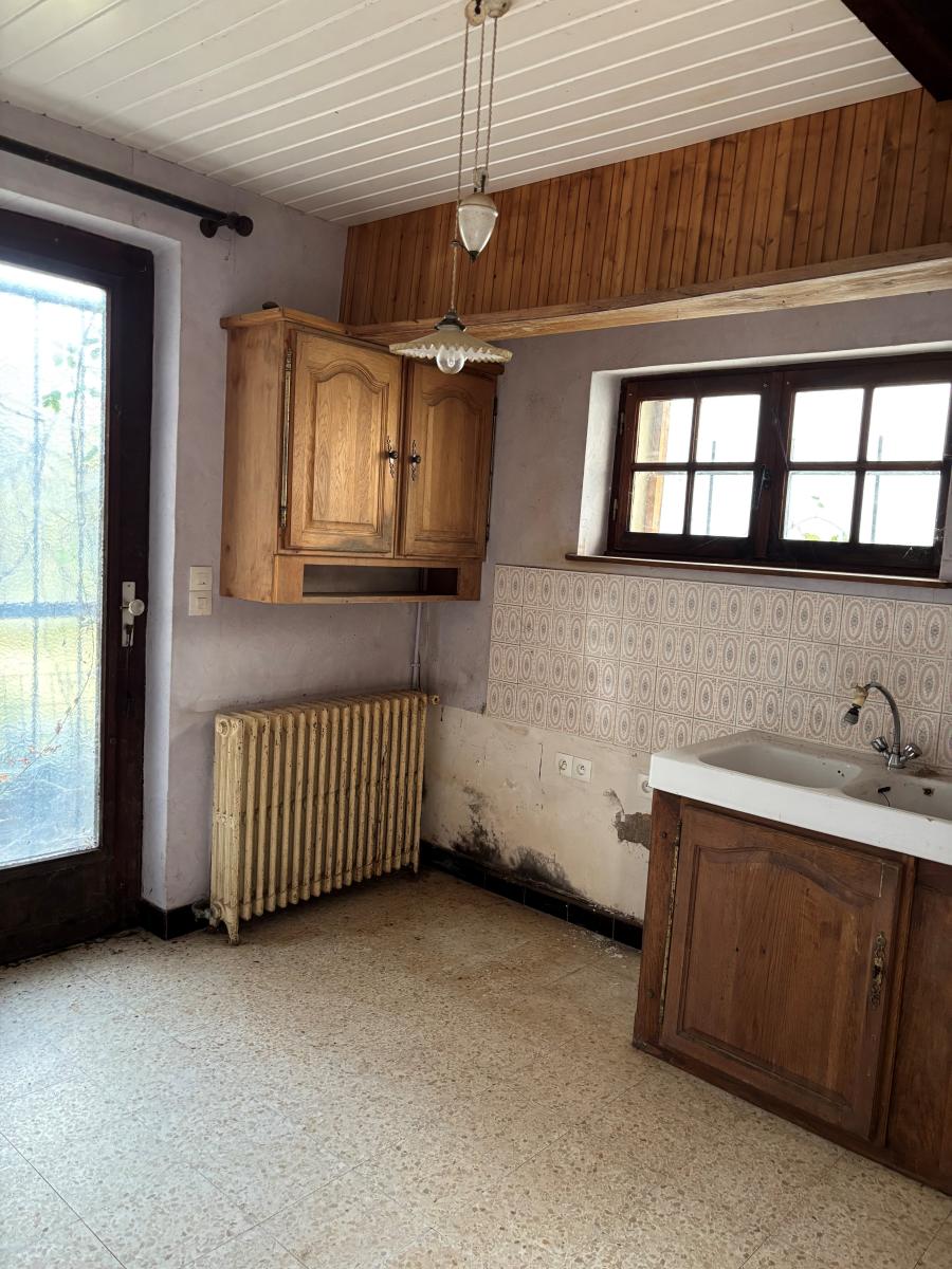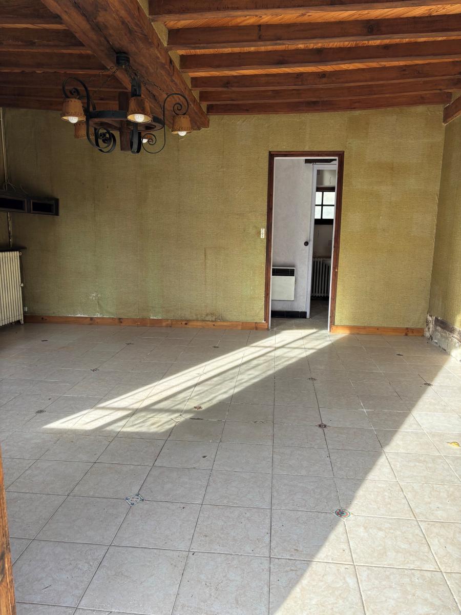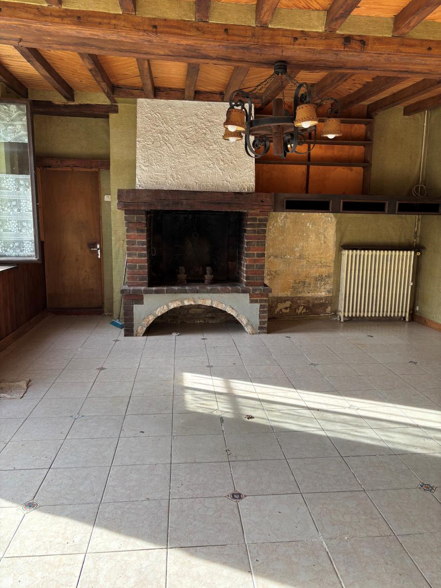 Salle à manger avec cheminée, cuisine, salle de douche, wc, deux chambres