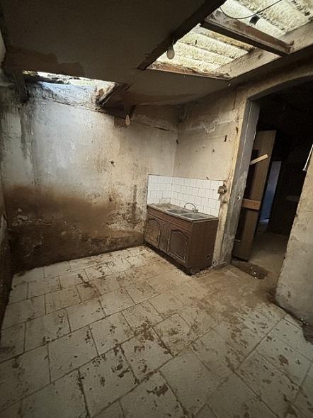 Le bien se compose au rez-de-chaussée : une entrée / couloir, un séjour, une cuisine, une salle de douche, un WC, un garage. Un étage est présent, mais non accessible en l’état. Absence d’extérieur (ni jardin, ni cour).