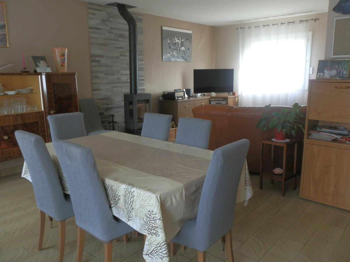 entrée, cuisine aménagée équipée, salle à manger – salon (poêle à bois), deux chambres (dont une avec placard), salle d’eau, wc avec lave-mains.
