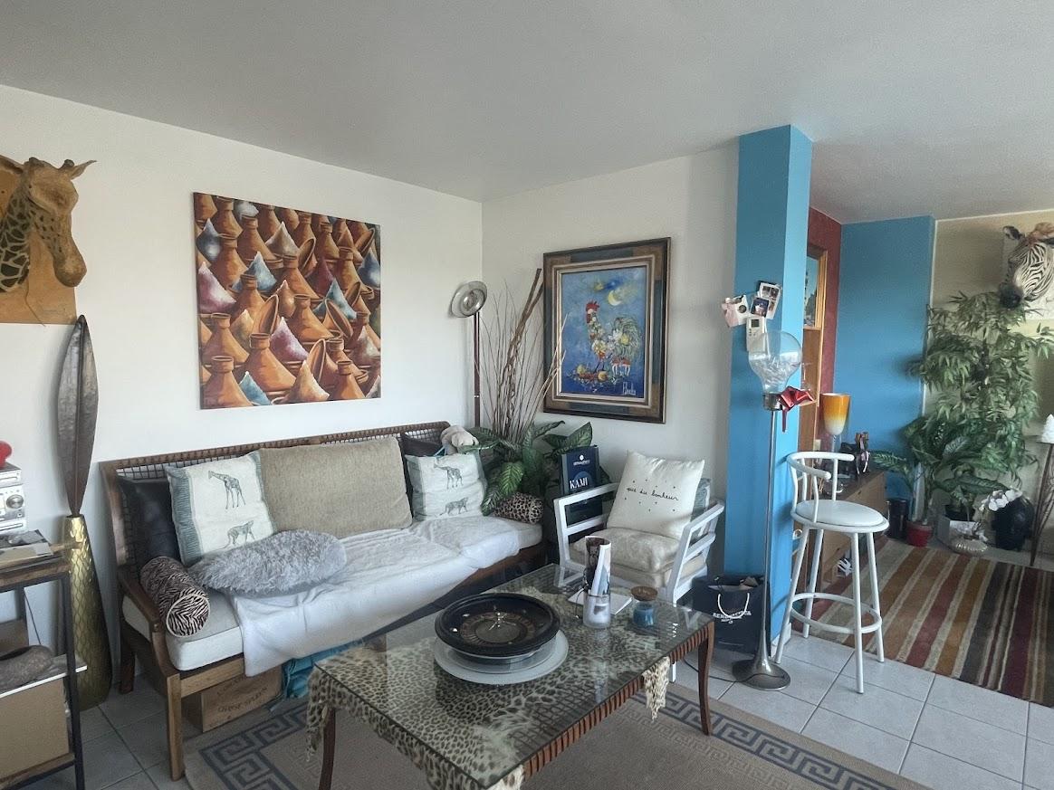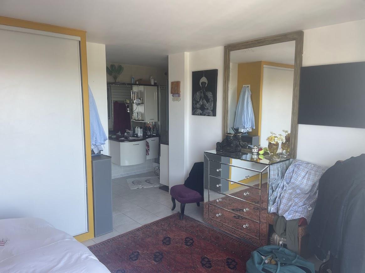 Un hall d'entrée, un grand espace de vie avec salon et cuisine aménagée et équipée ouverte avec un accès sur la grande terrasse d'environ 30m².