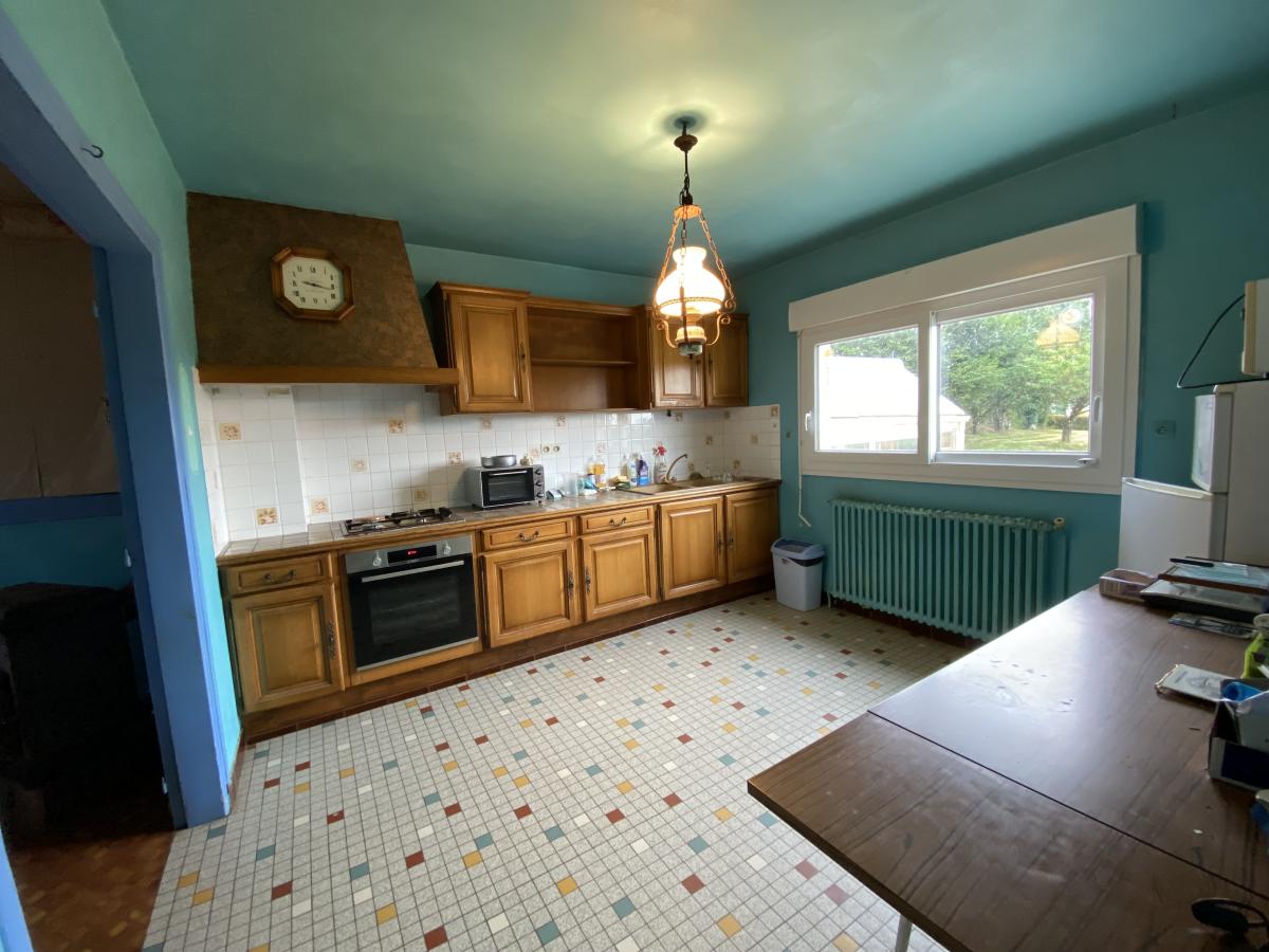Au rez-de-chaussée surélevé : entrée, cuisine aménagée et équipée, séjour avec poêle à bois, salle d'eau, wc, deux chambres.