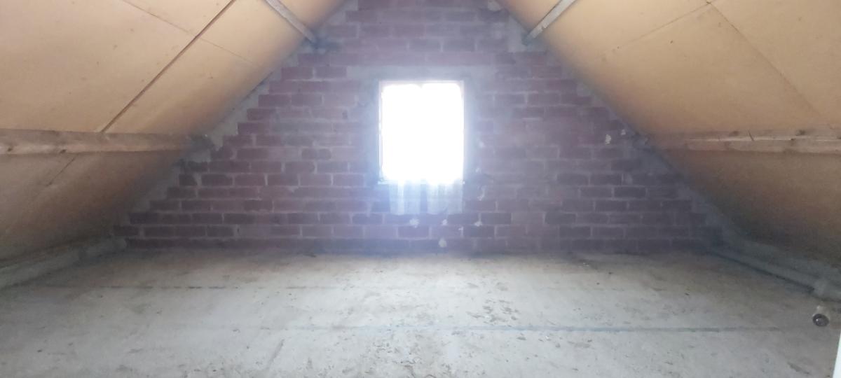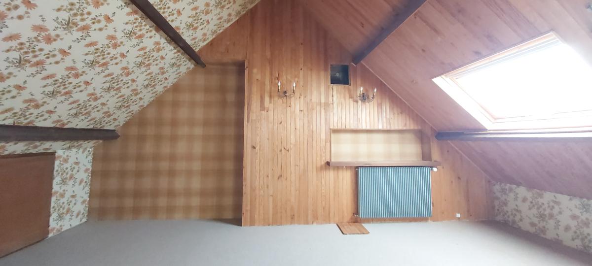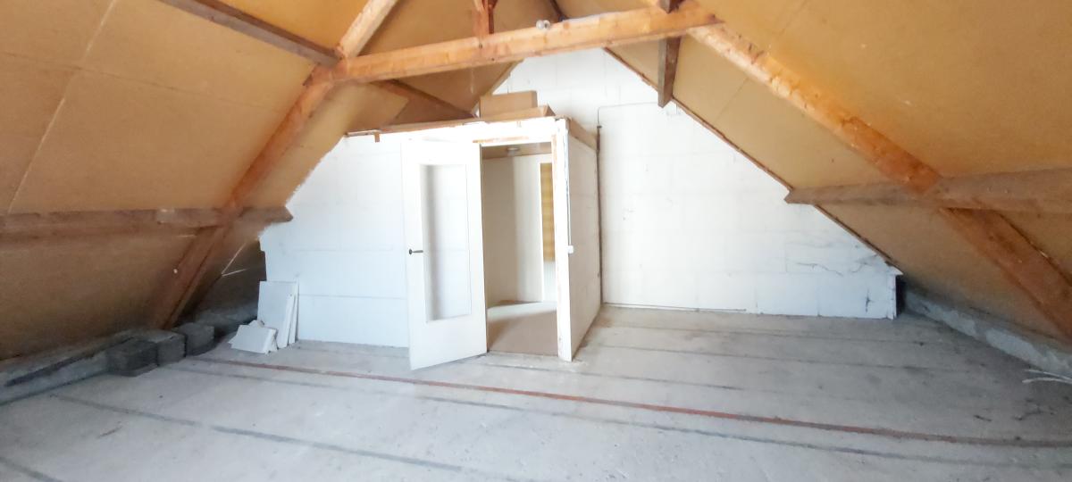 A l'étage : palier desservant une grande chambre avec placards en sous pentes, une 2ème grande chambre à finir d'aménager, WC,