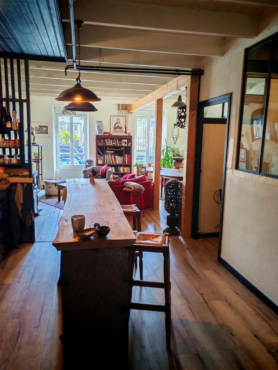 A l étage un appartement rénové avec beaucoup de gout , séjour salon insert, cuisine AE ouverte, deux suites parentales avec salle de bains et wc séparé, bureau , 2 garages avec différents accès et comble aménageable