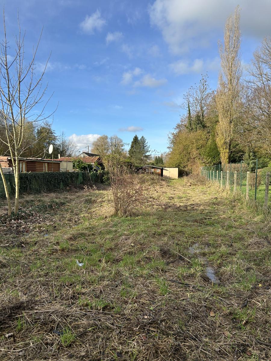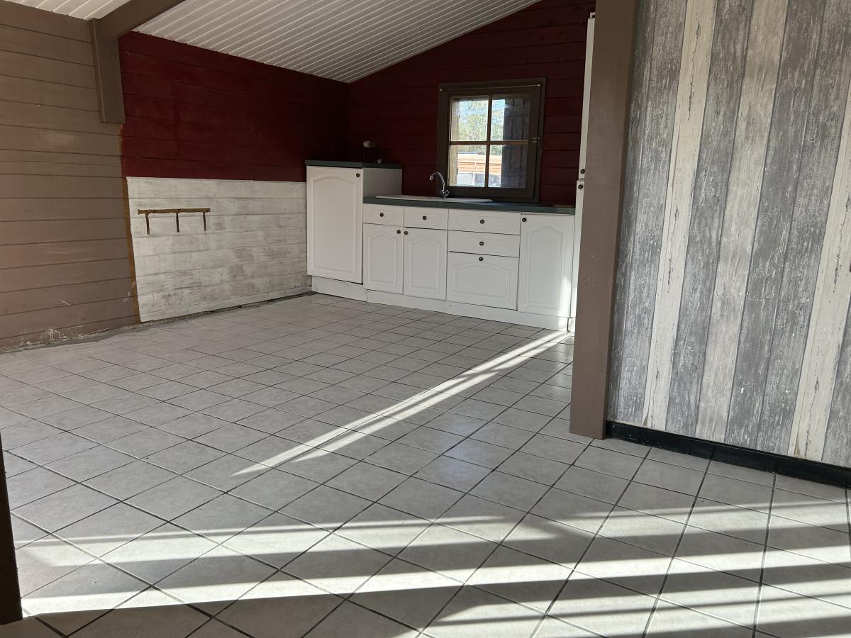 Chalet en bois sur dalle béton, de 25m², sans système de chauffage, mais disposant d'une cuisine en kit, du tout à l’égout, d'une cabine de douche et d'un WC
