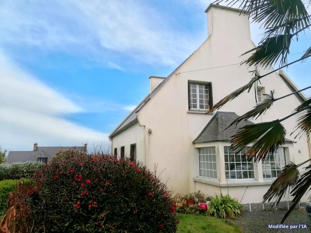 Maison type Néo Bretonne des années 70, élevée su sous sol total. Elle se compose d'une véranda d'entrée, une entrée, une cuisine A/E, un séjour, salon, dgt, WC, dgt, 2 chambres, salle de bain; A l'étage, un palier desservant 5 chambres, un bureau "lingerie". A l'extérieur, deux entrées, une cour et un jardin arboré et fleuri.