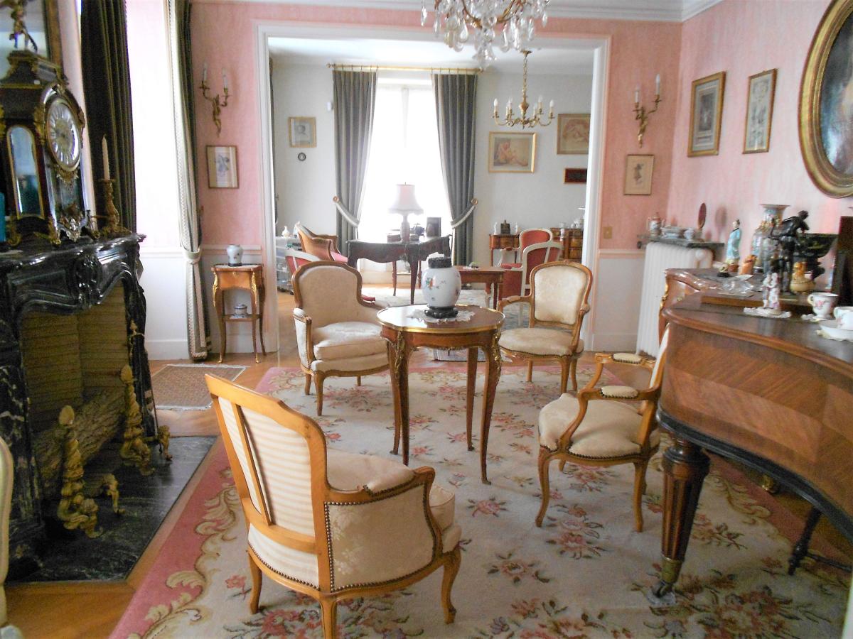From the moment you enter, the codes of the bourgeoisie of the period are apparent. Covered in a beautiful mosaic floor that continues down the long corridor, the entrance hall leads off to the left and right into a large, vast lounge with herringbone parquet flooring and a beautiful period fireplace, and a spacious dining room. A small boudoir-library adjoins, providing a cosy, relaxing atmosphere.