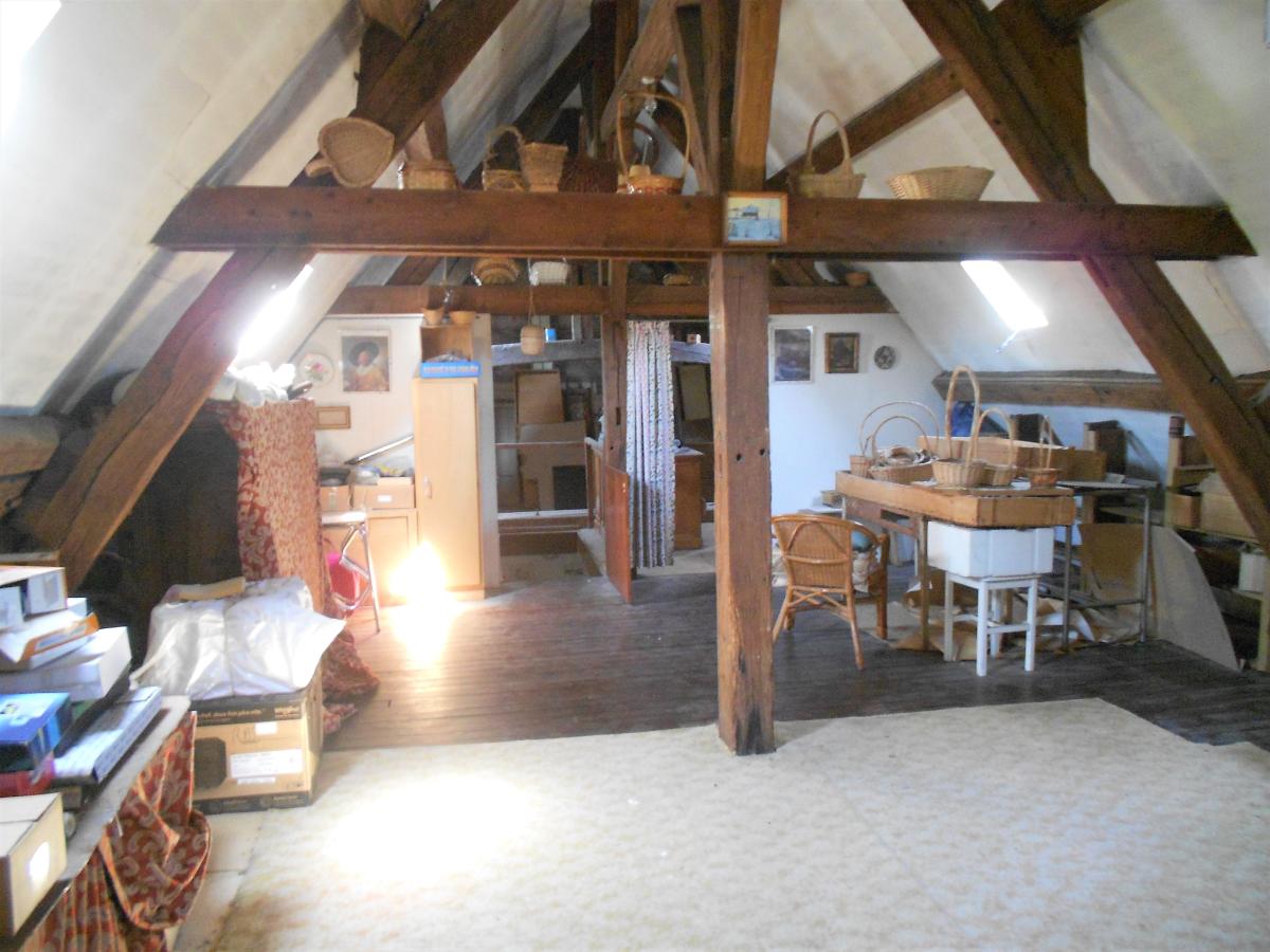 Attenant, une petite pièce à l’état brut fait office d’arrière-cuisine-buanderie-chaufferie. Par un escalier à l’architecture très ancienne, on accède à une petite chambre d’appoint avec point d’eau, un fruitier et un très grand grenier en deux parties communicantes avec une belle hauteur sous toit pouvant être aménagé.