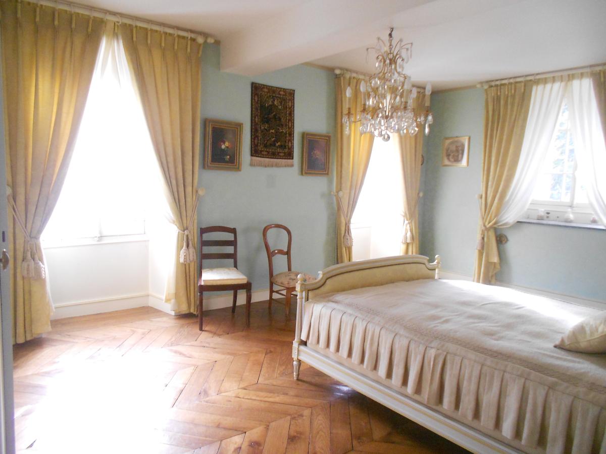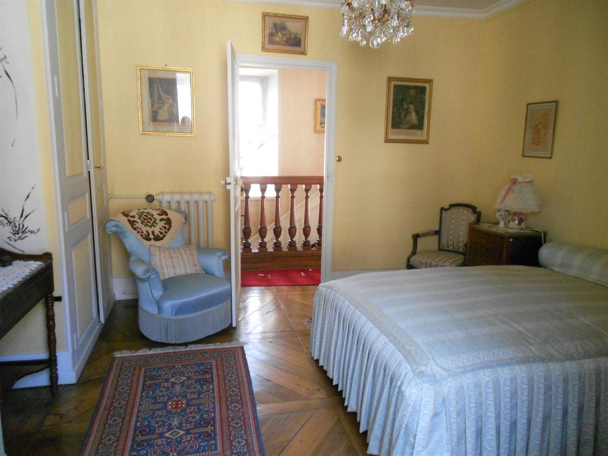 C’est par un escalier en bois massif provenant de l’Exposition Universelle de Paris, que l’on accède à l’étage principal de la maison, où un long palier dessert quatre jolies chambres dont une avec point d’eau et une très grande en coin de bâtisse bénéficiant ainsi d’une multi-exposition. À l’exception d’une chambre, l’ensemble est parcouru d’un sol en parquet en pin et en chêne posé en point de Hongrie.