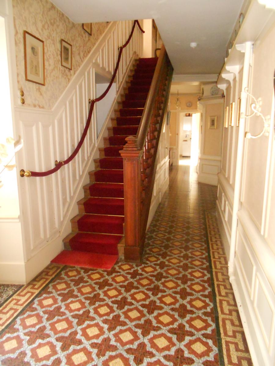 Dès l’entrée, les codes de la bourgeoisie d’époque s’expriment. Tapis d’un très beau sol en mosaïque qui se poursuivra dans le long couloir, le hall d’entrée distribue à gauche et à droite un grand et vaste salon recouvert d’un parquet point de Hongrie et aménagé d’une très belle cheminée d’époque, et une spacieuse salle à manger. Dans sa continuité, une petite pièce boudoir-bibliothèque offre une atmosphère feutrée et reposante.