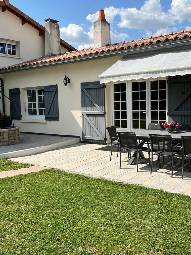Grande terrasse orientée Sud et abritée en partie par un auvent avec cuisine d'été.