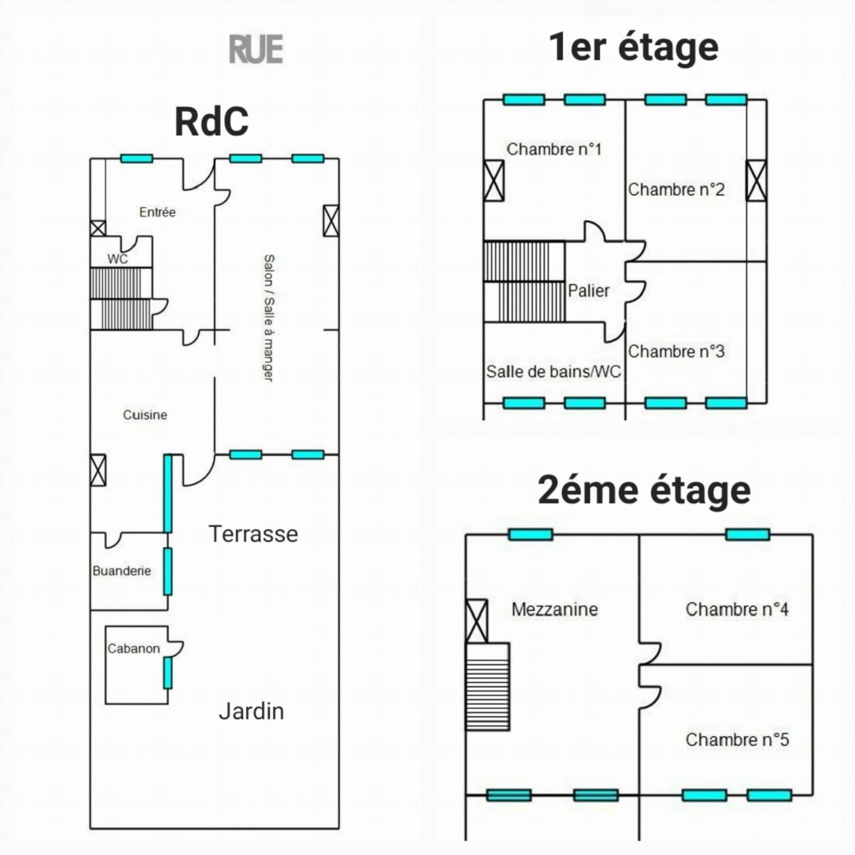 Etage 1 : palier, salle de bains complète avec wc, 3 chambres dont 2 avec placard.