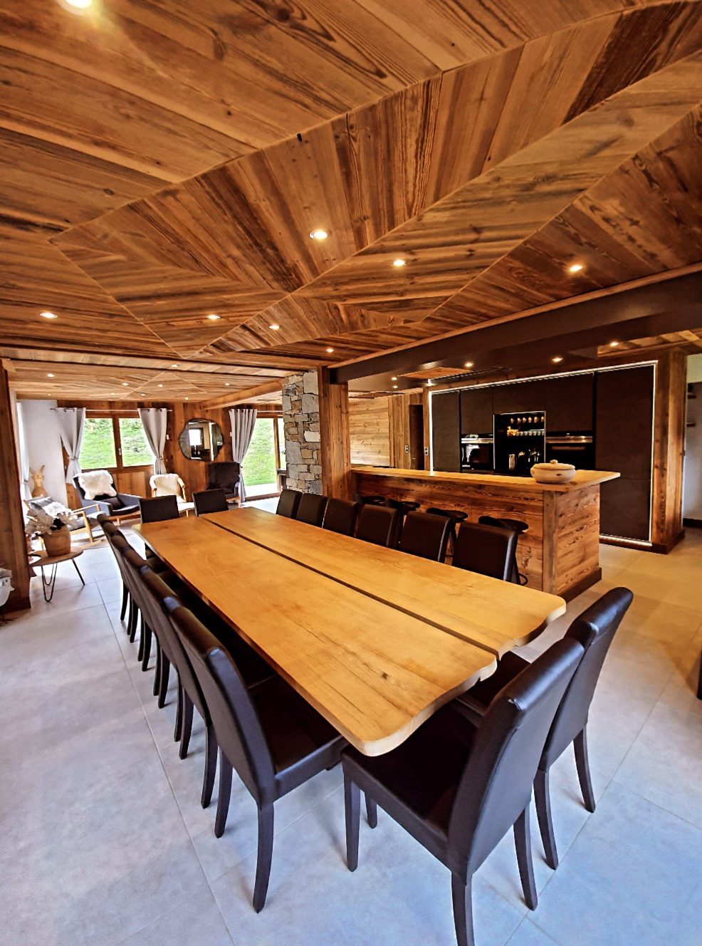 Le séjour est équipé d'une table sur-mesure taillée dans un tronc d'arbre local.