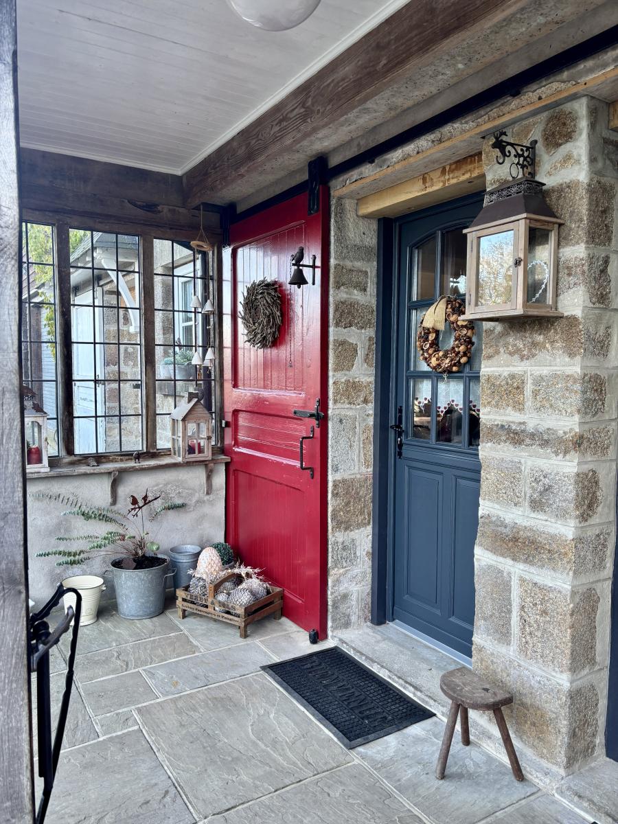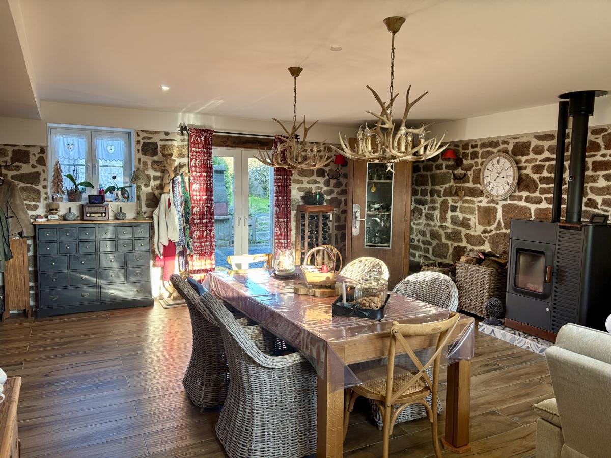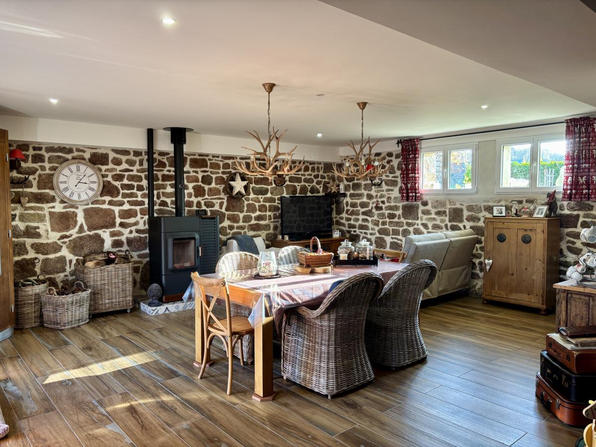 - Au rez-de-chaussée : un porche d’entrée, un salon chaleureux avec poêle à bois, une grande cuisine conviviale, une vaste pièce de vie lumineuse regroupant salon et salle à manger et un autre poêle, WC, cellier et chaufferie.