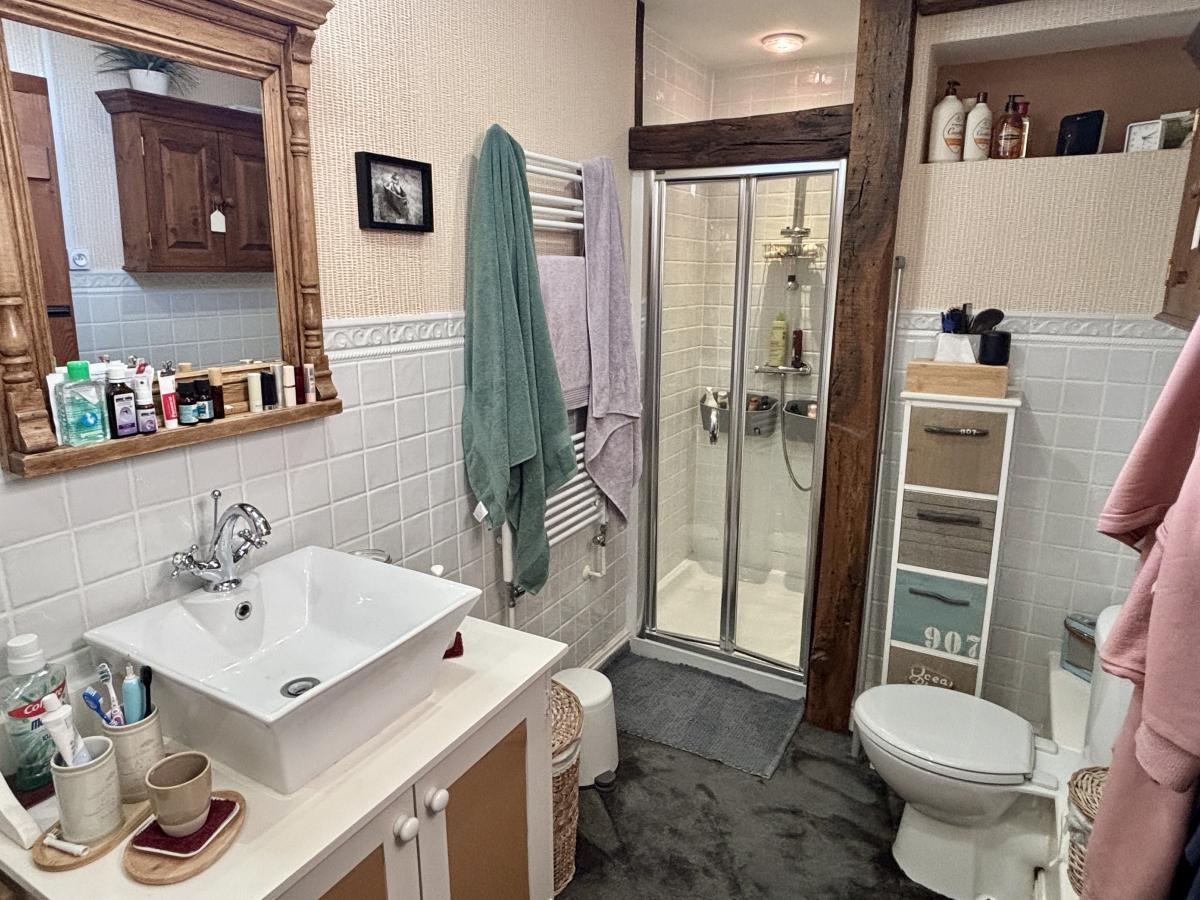 - À l’étage : un palier-bibliothèque desservant quatre belles chambres et une salle de bains avec douche et WC.