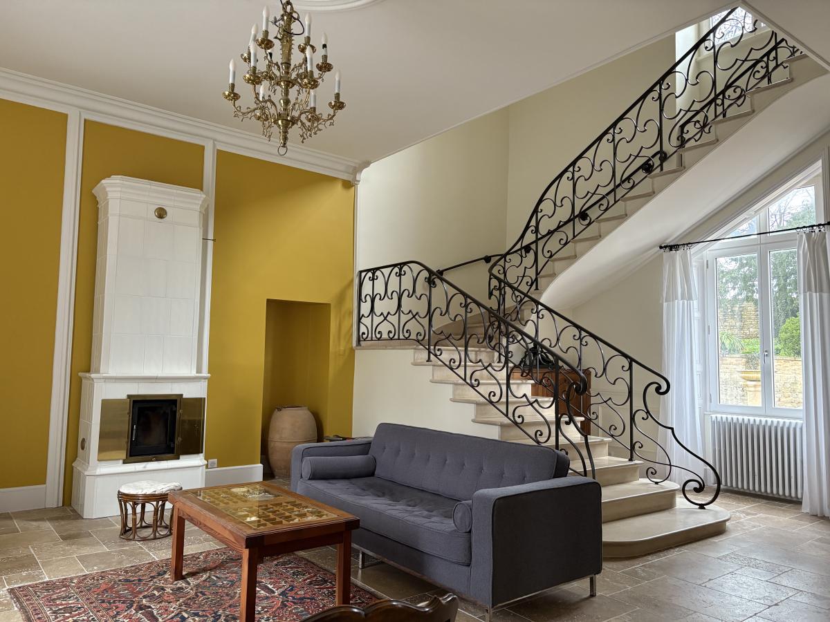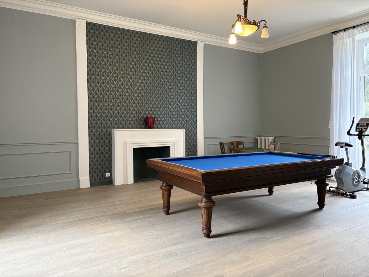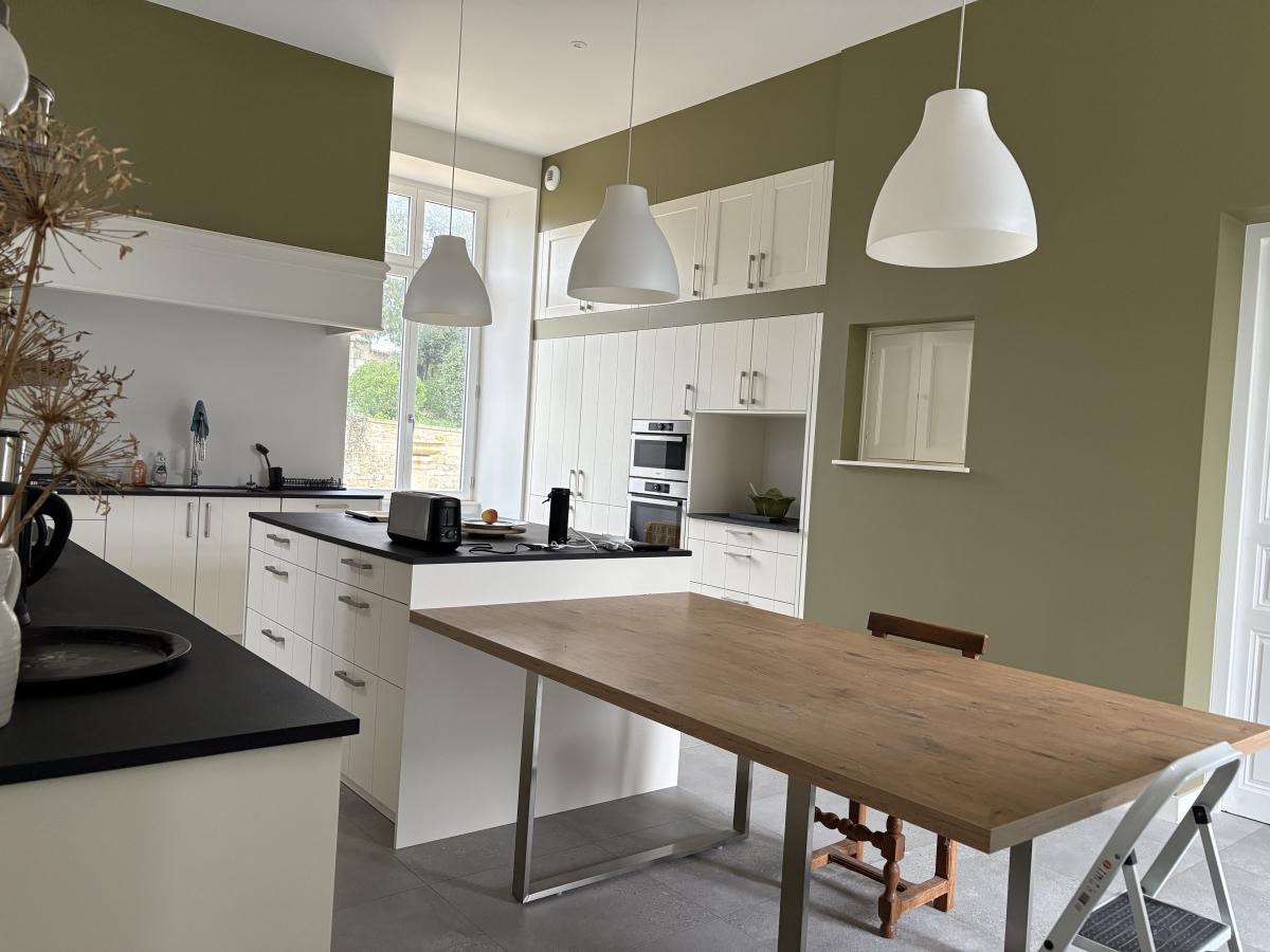 Au rez-de-chaussée : Entrée - Bureau - Grand Salon avec cheminée qui est fermée - Petit Salon avec poêle de masse - Salle à manger avec cheminée déco - Deuxième entrée - W.C. suspendu avec lave mains et douche - Local Technique - Grande cuisine aménagée et équipée (cave à vin, four, micro-onde, lave-vaisselle, plaque gaz, hotte, réfrigérateur-congélateur) -