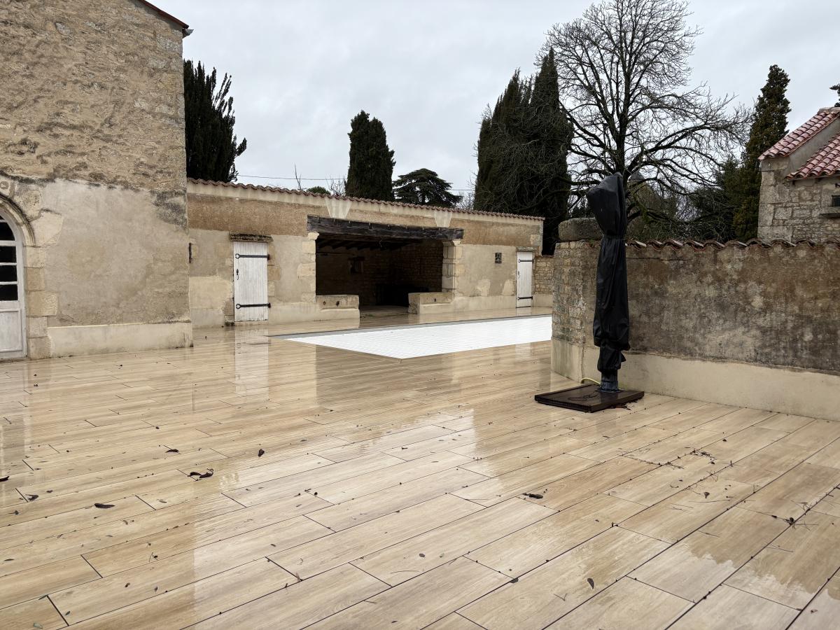 Grande terrasse carrelée avec piscine coque chauffée et son rideau de sécurité - Deux préaux - Local technique - Vestiaire - Douche extérieure -
