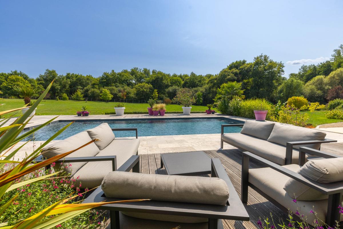 La maison principale comprend également une terrasse de 100 m² exposée plein sud et un balcon de 30 m², idéals pour profiter de la piscine et de la vue sur le jardin et l'horizon dégagé.