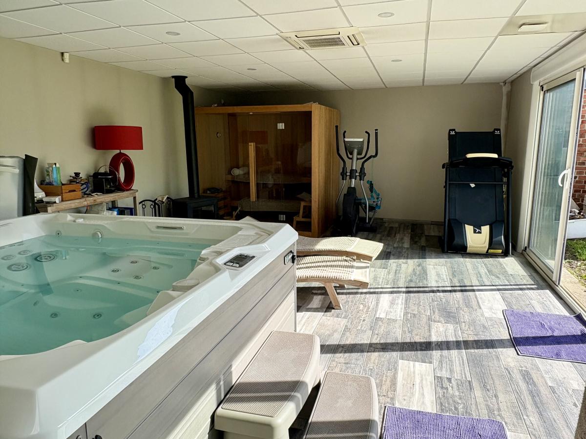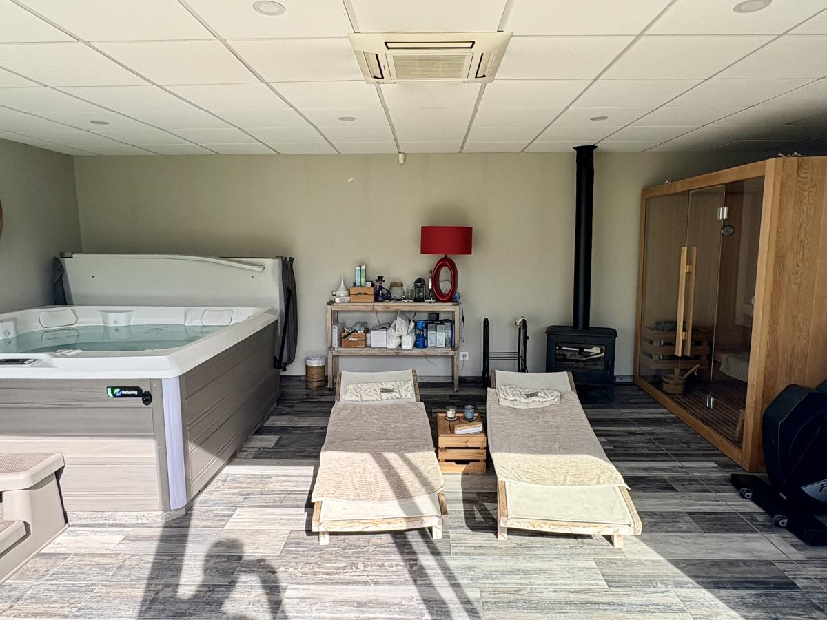 - Rez-de-chaussée : hall d'entrée, séjour, buanderie, cuisine équipée, cellier, salle de bains, une pièce avec jacuzzi et sauna, salon, deux chambres, salle d’eau avec WC, dressing, WC.
