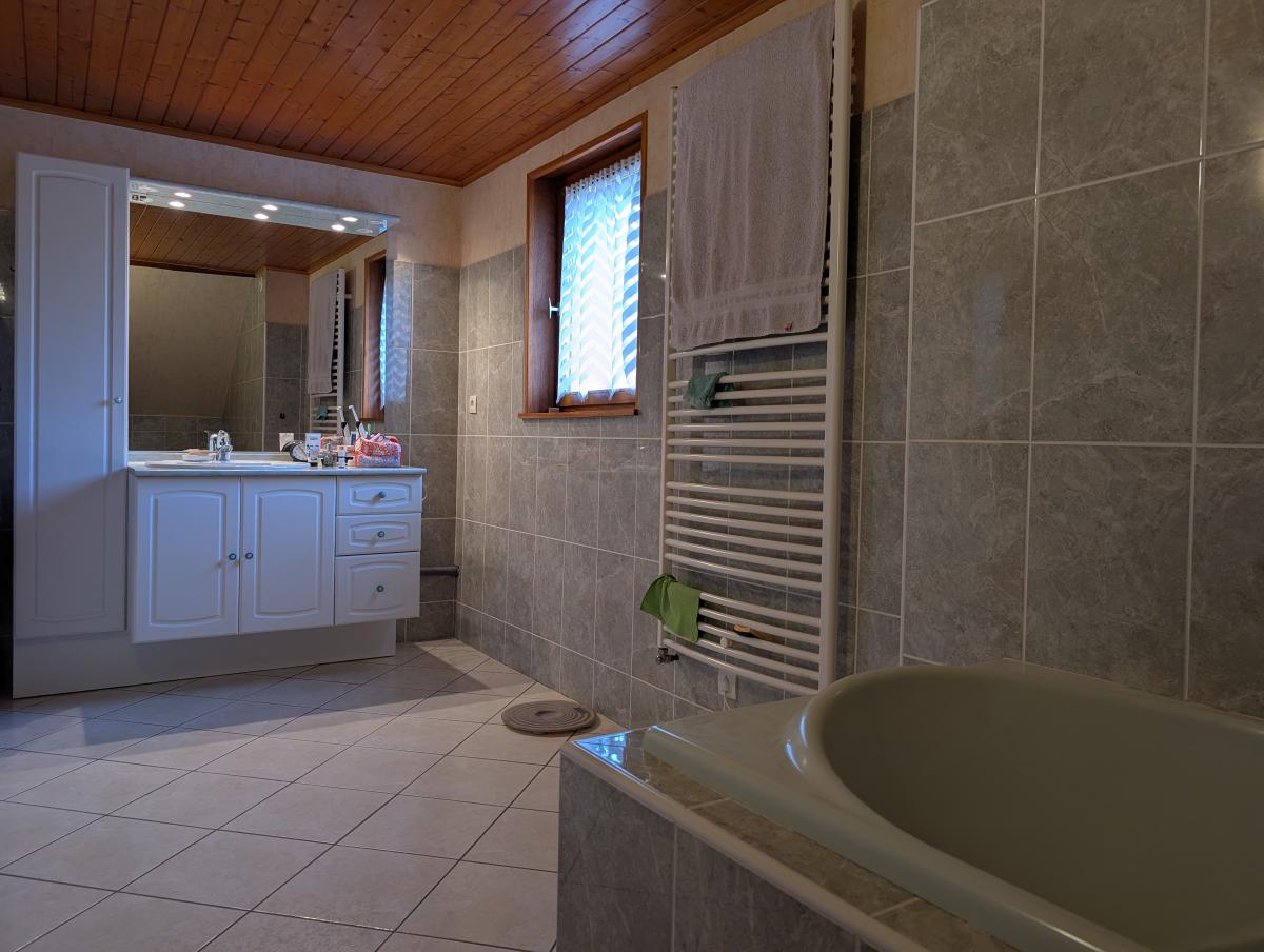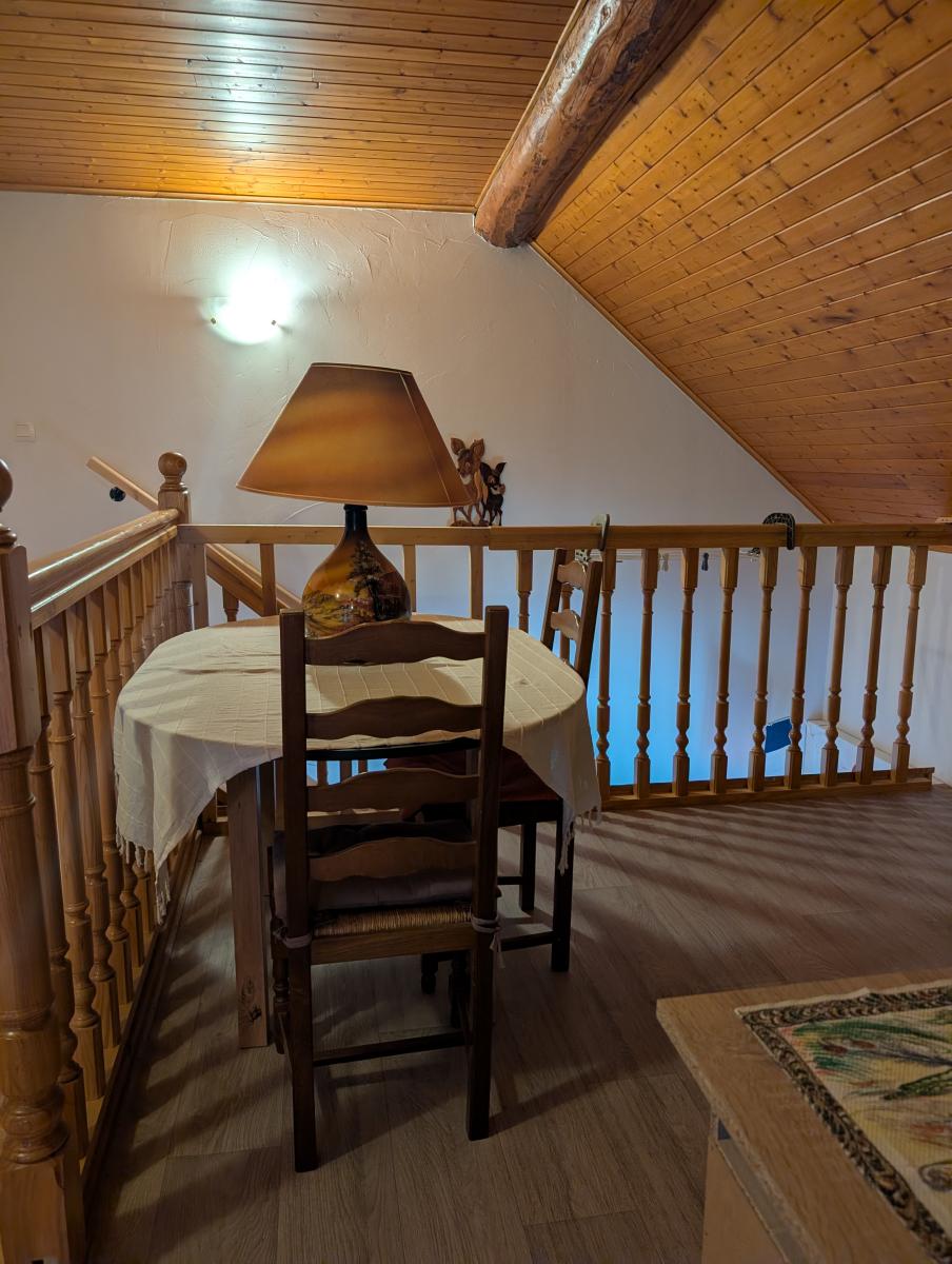 à l'étage , un hall avec mezzanine dessert 3 chambres et une salle de bains avec WC indépendant .