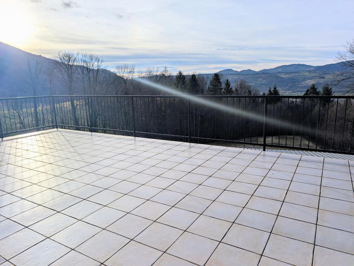 un escalier extérieur couvert , mène à la grande terrasse de 30 m² avec vue panoramique .