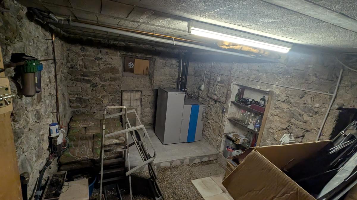 en sous-sol , on trouve la chaufferie -buanderie de 18.54 m² et permettant le stockage des granules et une cave de 24.26 m² , idéale pour la conservatioon des denrées.