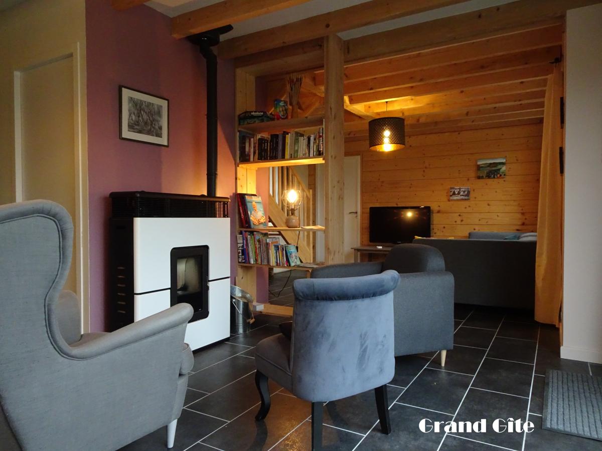 o RDC : cuisine/salle à manger avec poêle à bois, buanderie/cellier, WC, chaufferie, un bureau et un salon avec poêle à bois.