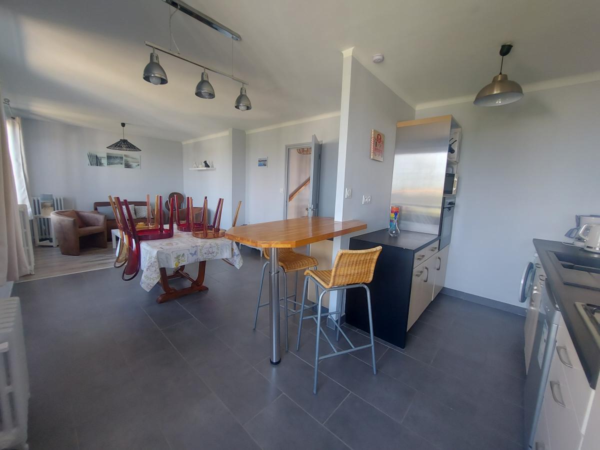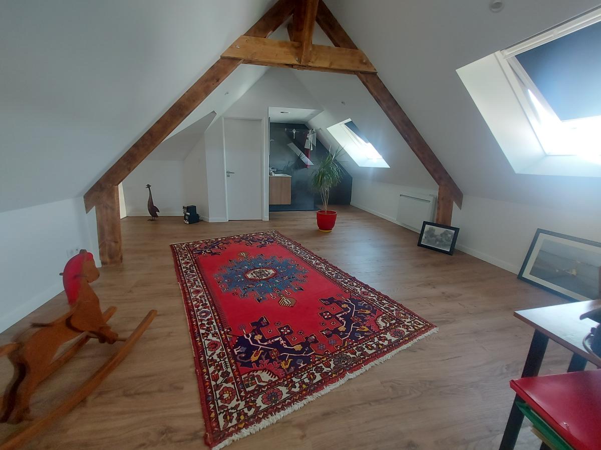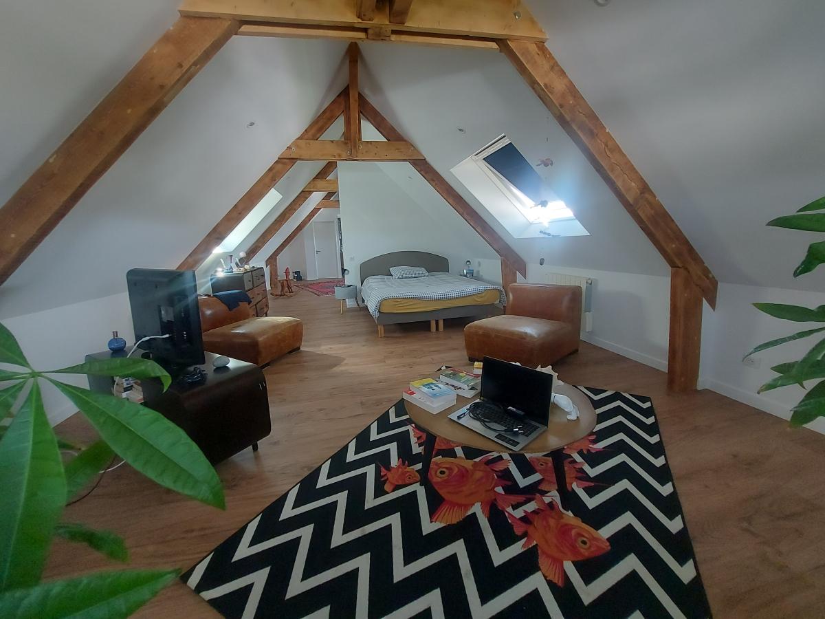 Un logement indépendant T3 duplex, salle-salon avec cuisine ouverte, une chambre, douche, WC, une deuxième chambre en duplex avec un grenier.